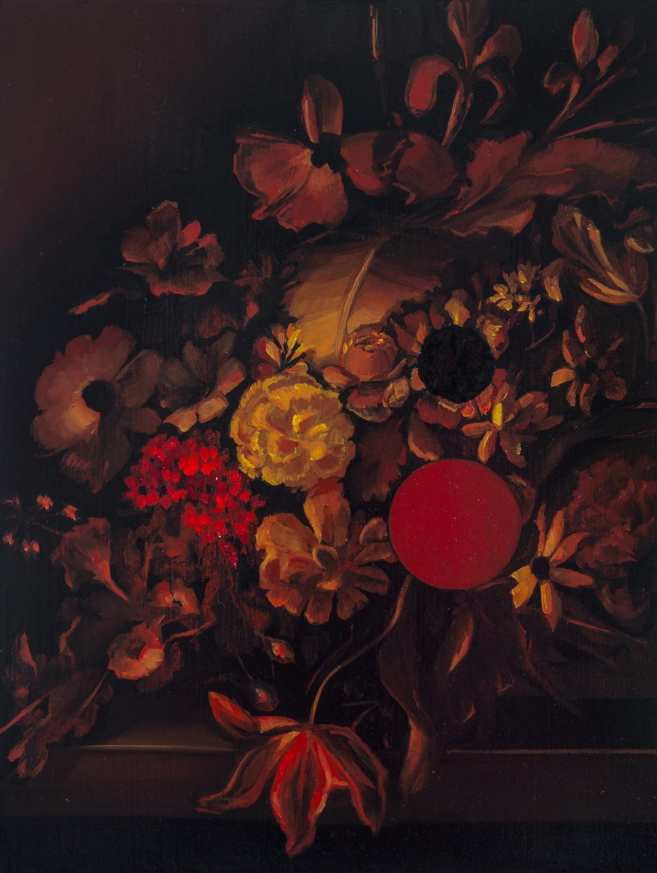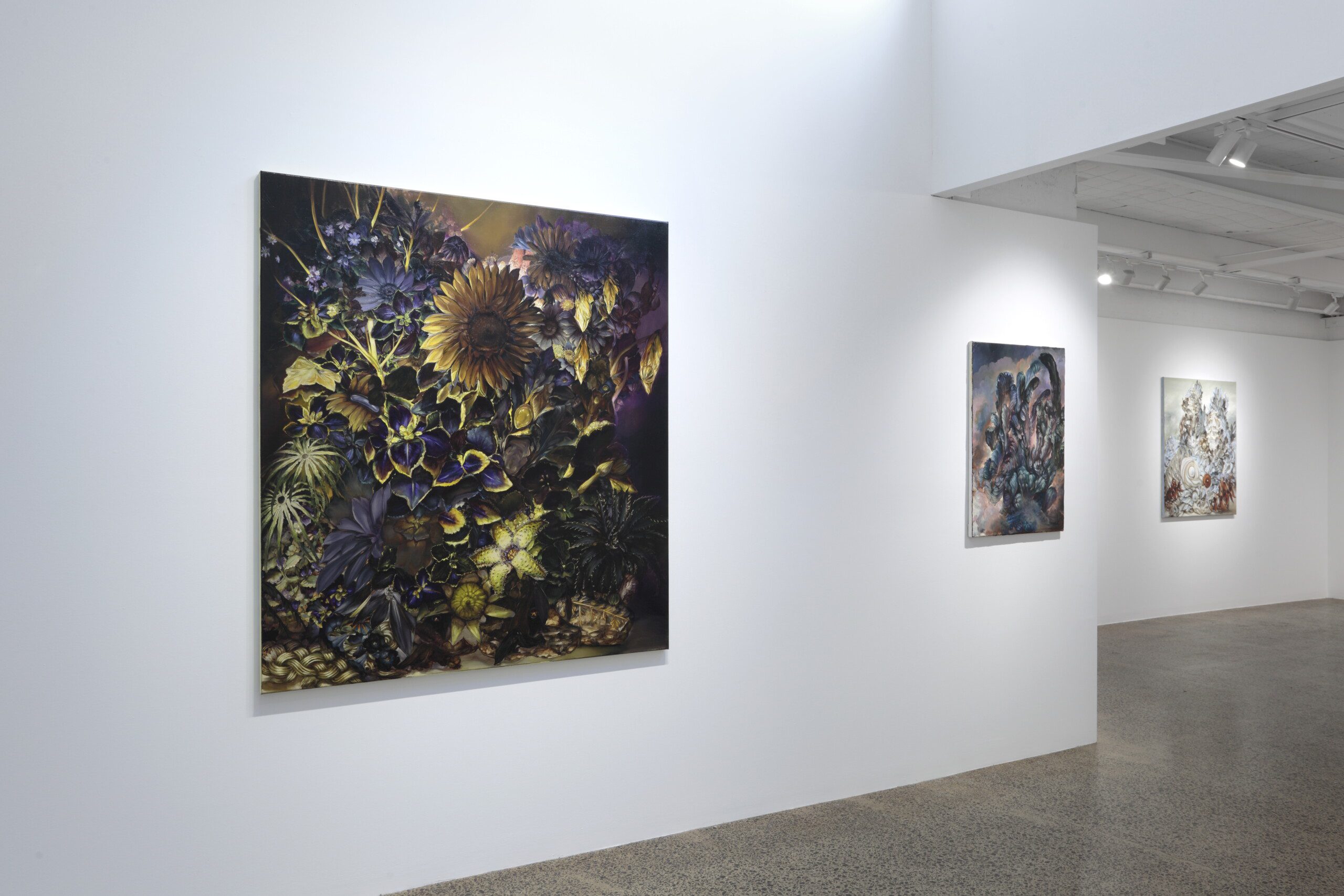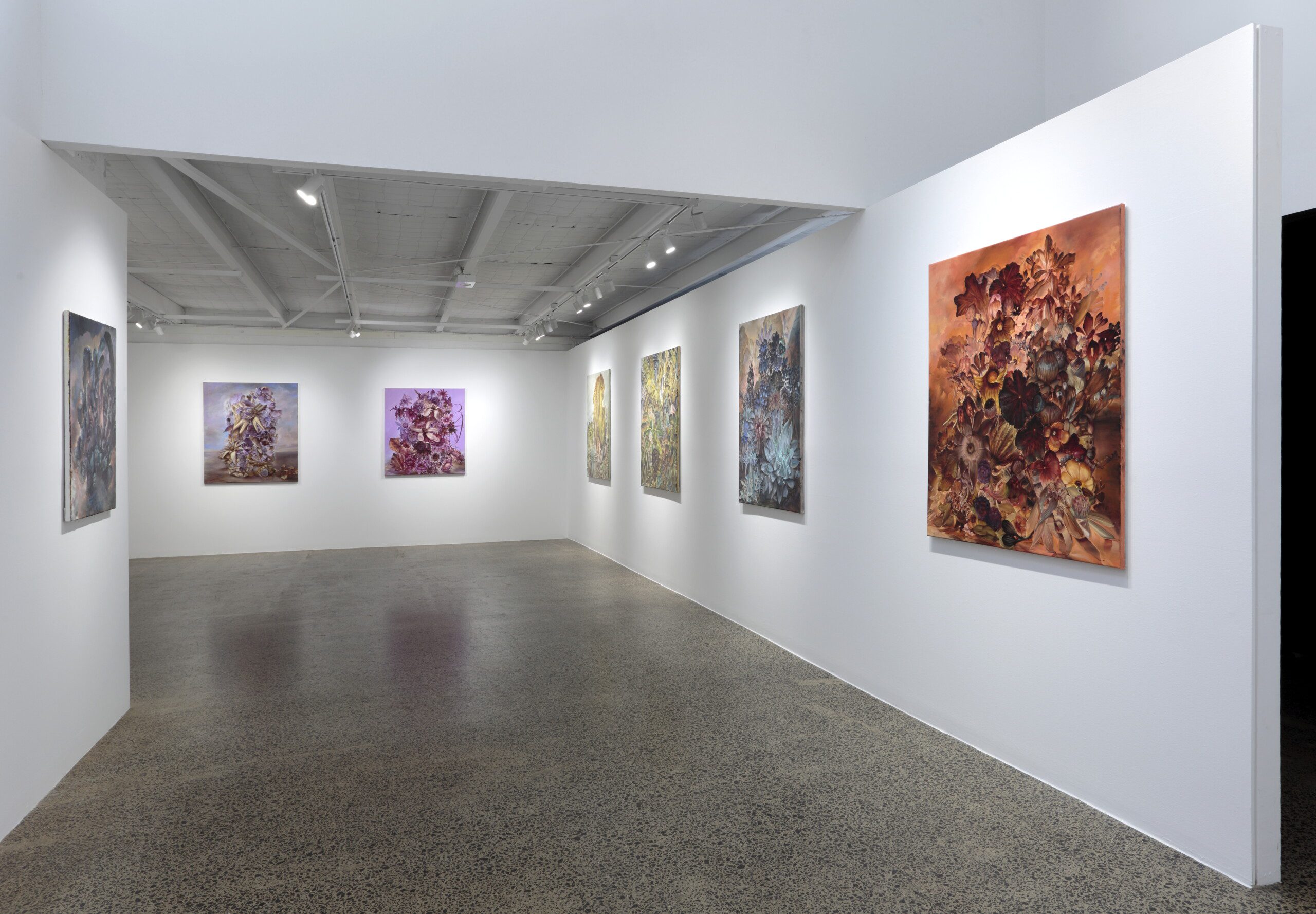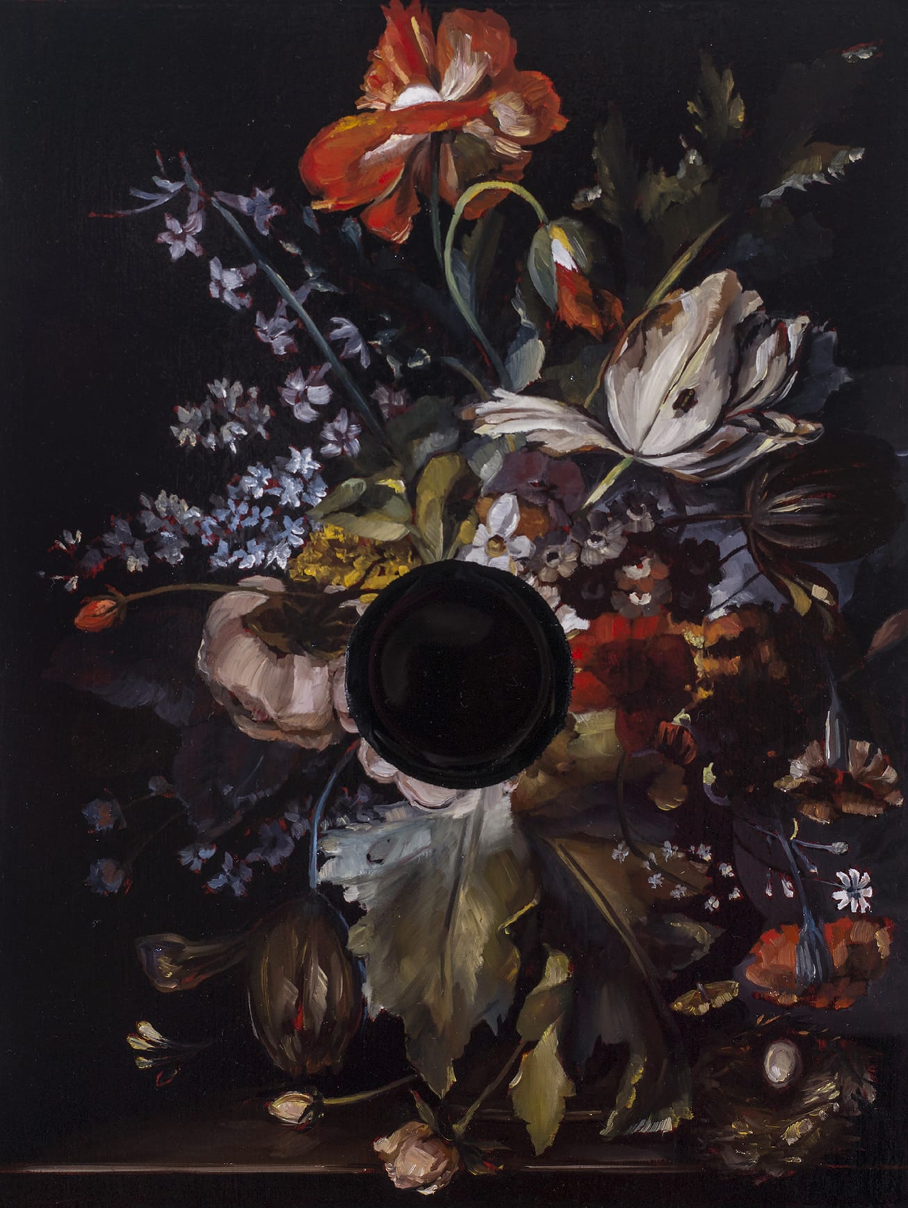 Drawing on a lexicon of the familiar as a means to address anxieties afflicting contemporary living, previous collections in my oeuvre examined thresholds delineating public and private worlds. Scenes of chaotic domestic interiors, suburban vistas and unruly landscapes metaphorically sought to portray the human subject in its absence. Since 2016 my practice has orientated towards the floral still life genre as a means of expression. Through use of art historical appropriation and invention recent bodies of work have utilised a tragic-comic sensibility to scrutinise sociological systems and question our historical moment. Subverting traditions of 17th century Dutch still life painting the collection entitled, After Nature, exhibited with Nicholas Thompson Gallery in 2017, applied the impossible bouquet as a stand in for nascent market-capitalism. This body of work sought to conflate relationships between nature, culture and neo-liberal economics with understated nihilist humour.