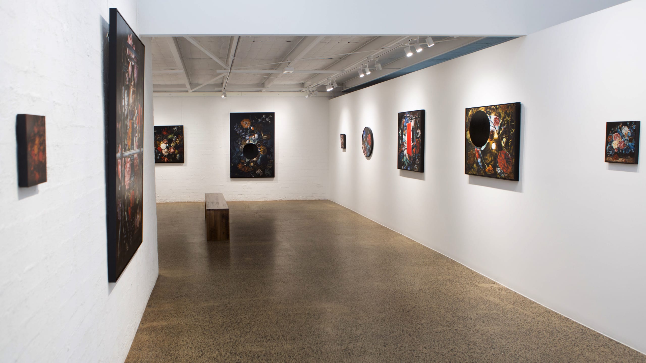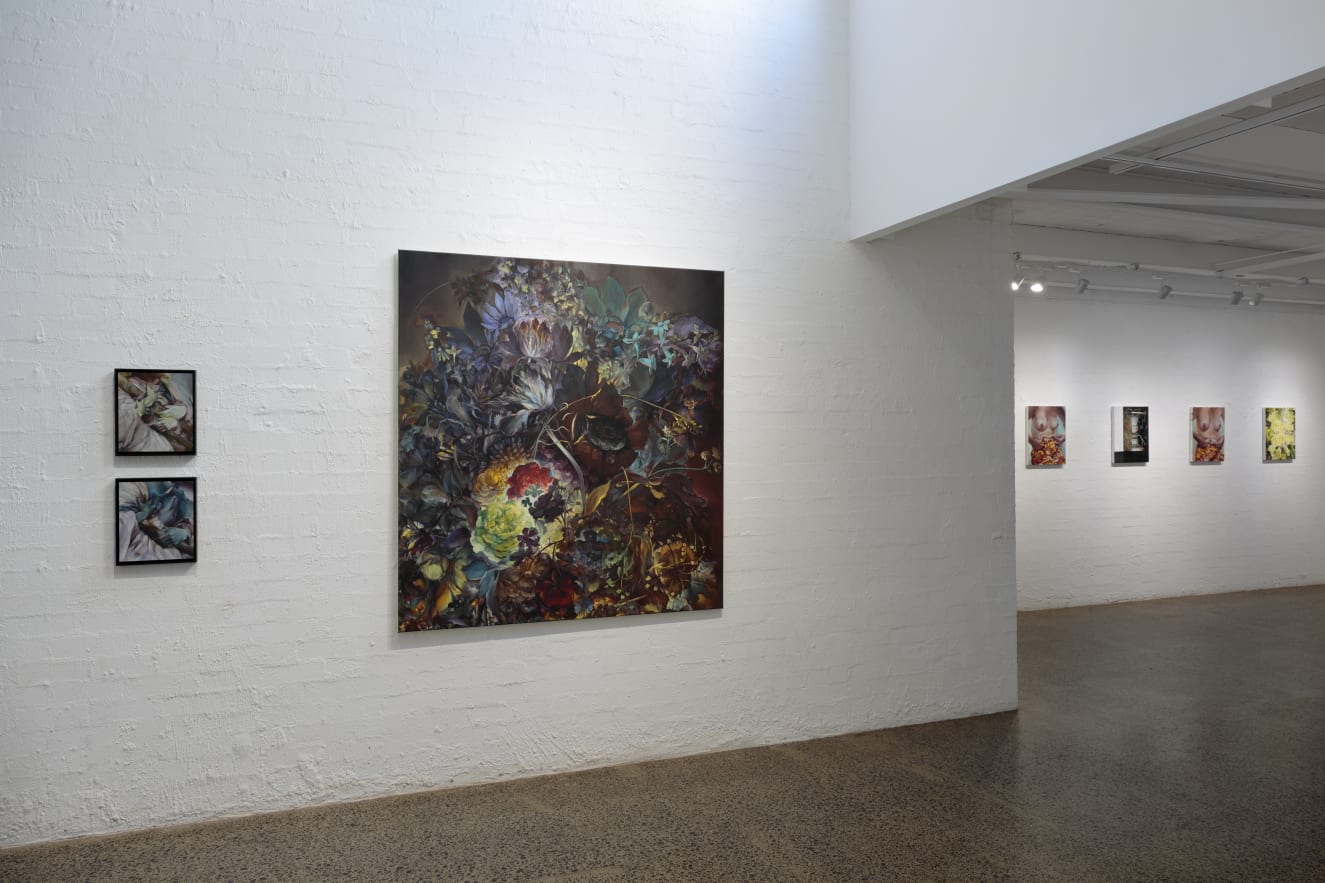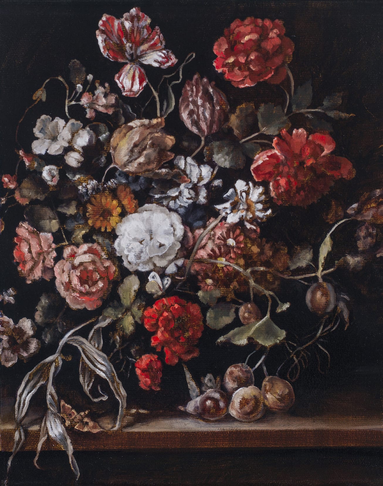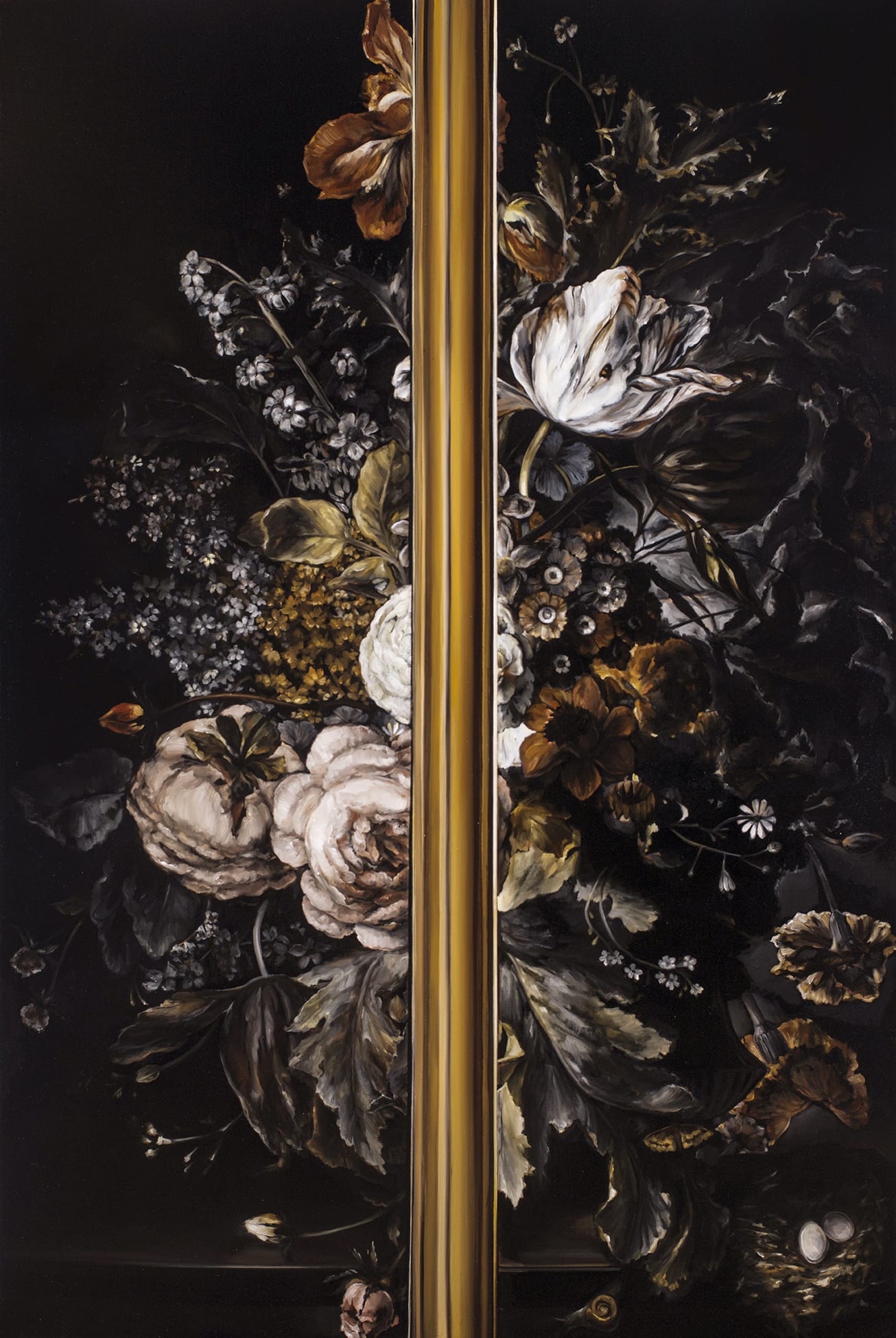 Drawing on a lexicon of the familiar as a means to address anxieties afflicting contemporary living, previous collections in my oeuvre examined thresholds delineating public and private worlds. Scenes of chaotic domestic interiors, suburban vistas and unruly landscapes metaphorically sought to portray the human subject in its absence. Since 2016 my practice has orientated towards the floral still life genre as a means of expression. Through use of art historical appropriation and invention recent bodies of work have utilised a tragic-comic sensibility to scrutinise sociological systems and question our historical moment. Subverting traditions of 17th century Dutch still life painting the collection entitled, After Nature, exhibited with Nicholas Thompson Gallery in 2017, applied the impossible bouquet as a stand in for nascent market-capitalism. This body of work sought to conflate relationships between nature, culture and neo-liberal economics with understated nihilist humour.