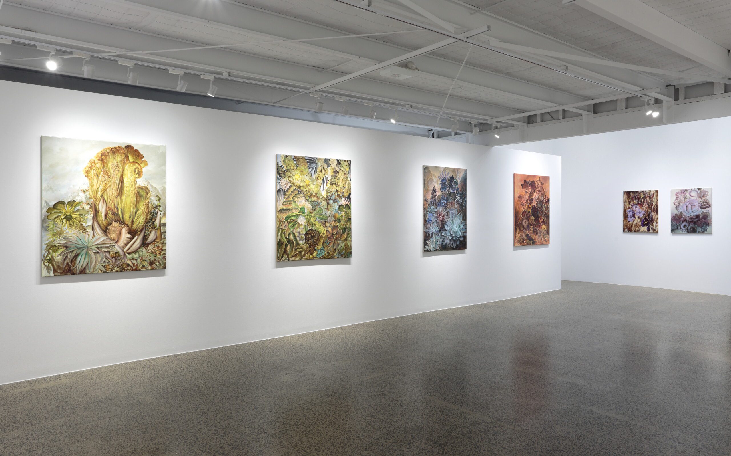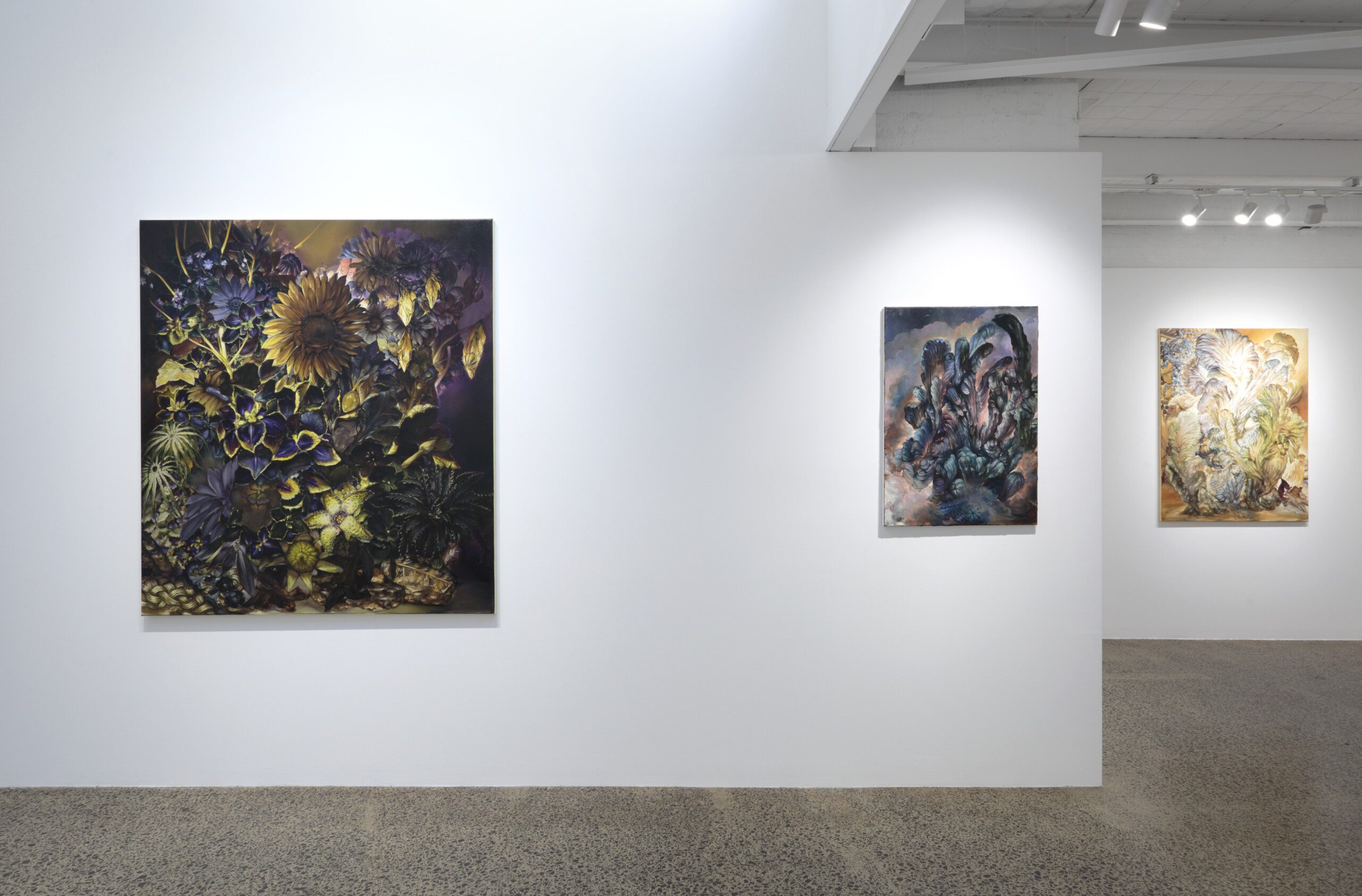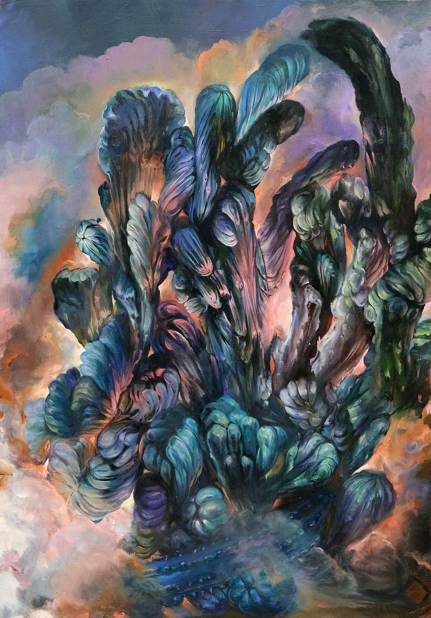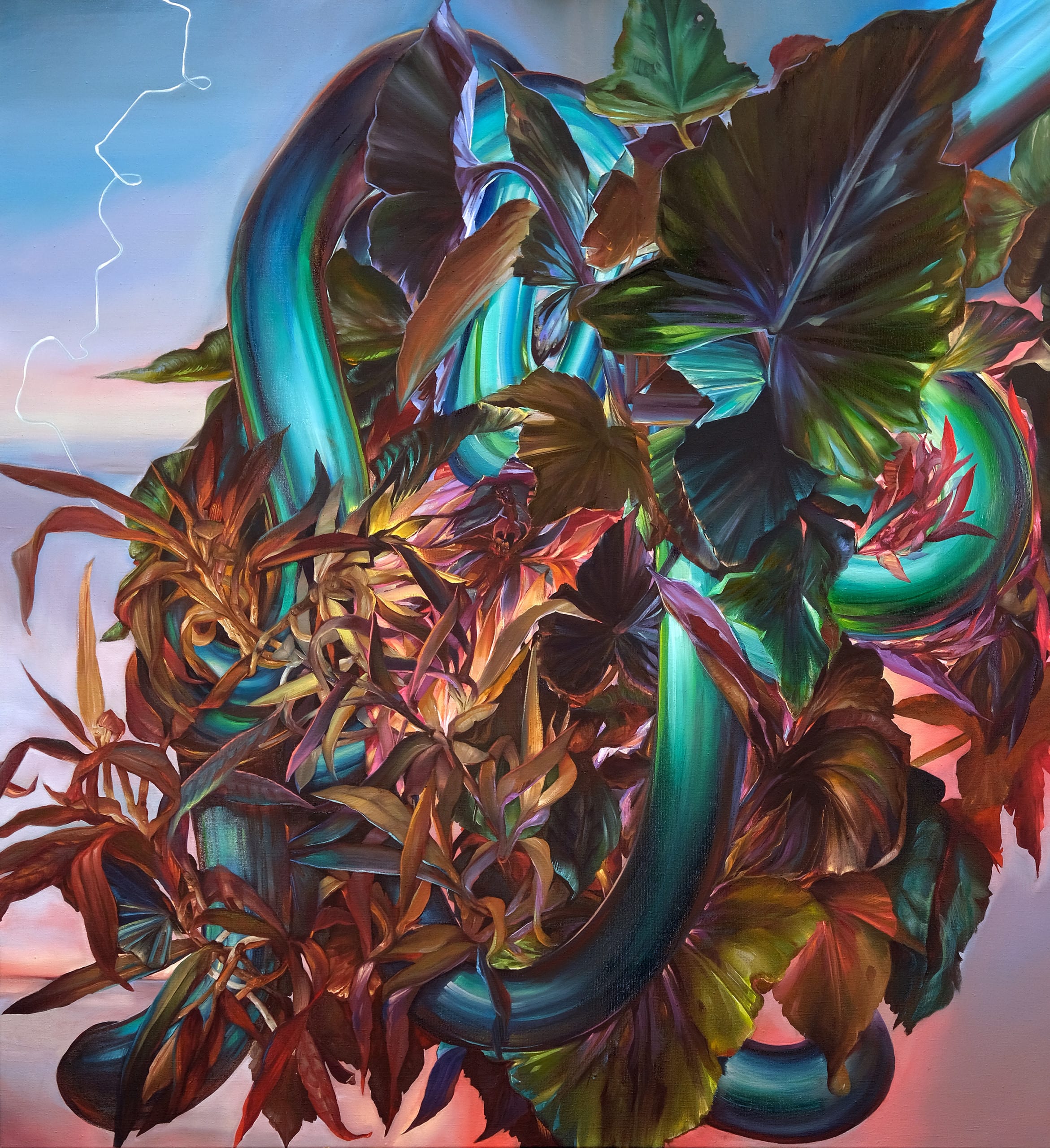 Here I paint complex entanglements of multi-genus flora in hyper-natural, Post-Humanist scenes. In reimagined ecosystems non-human subjects are presented as heroic and embodied with agency. Conflating laws of time, biology and chemistry, these non-human protagonists display a potential for infinite adaptation, mutation and hybridity. They blend existing and fantastical botanical species within landscapes unsettled by the forces of eerie weather phenomena. Picture the convergence of desert and oceanic landscapes, tidal expanses and alpine summits, all overgrowing the remnants of a bygone anthropocentric world. In their place, new organic monuments rise.