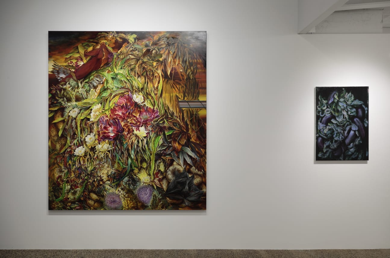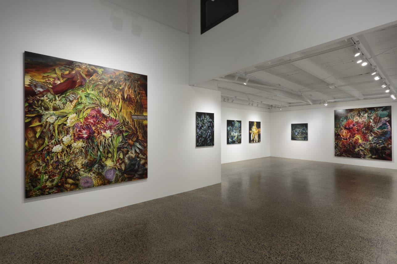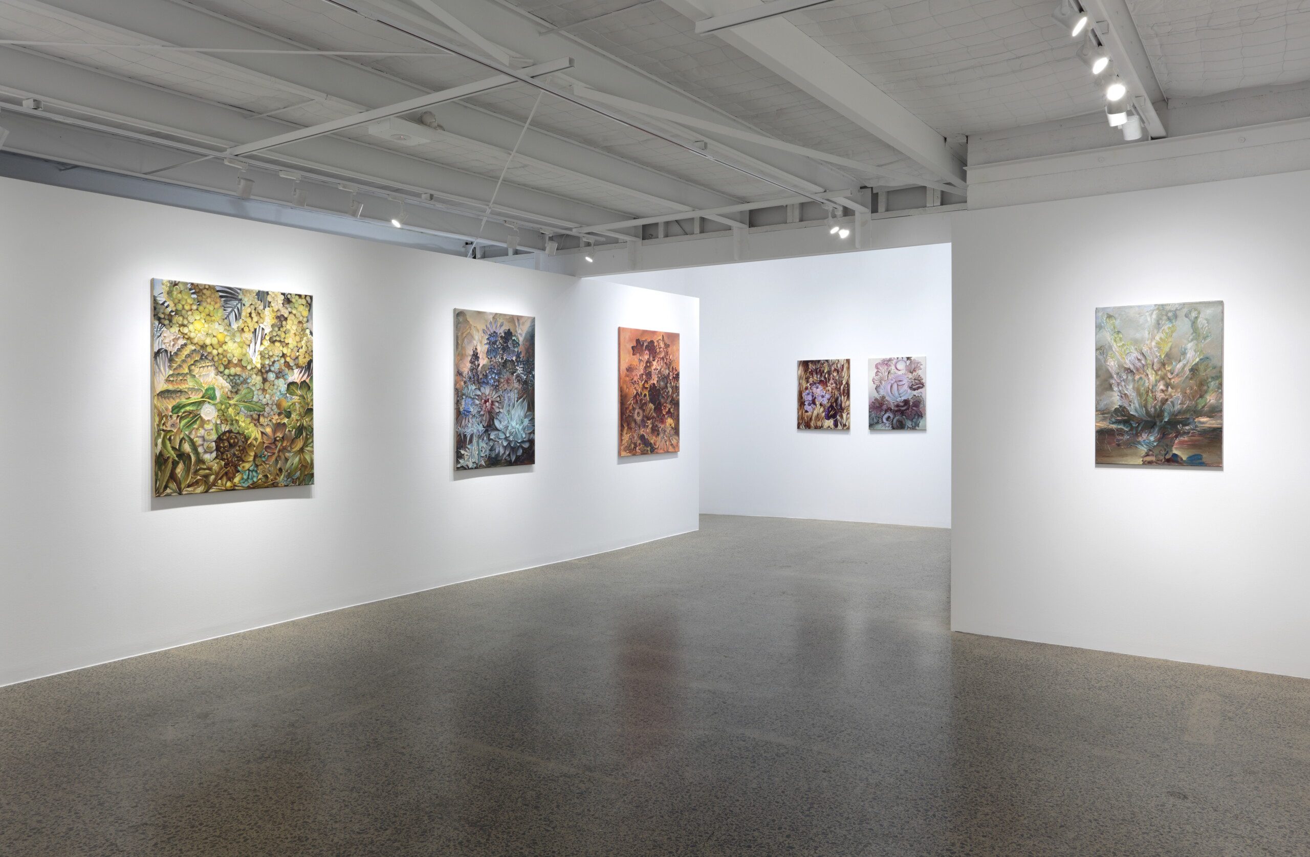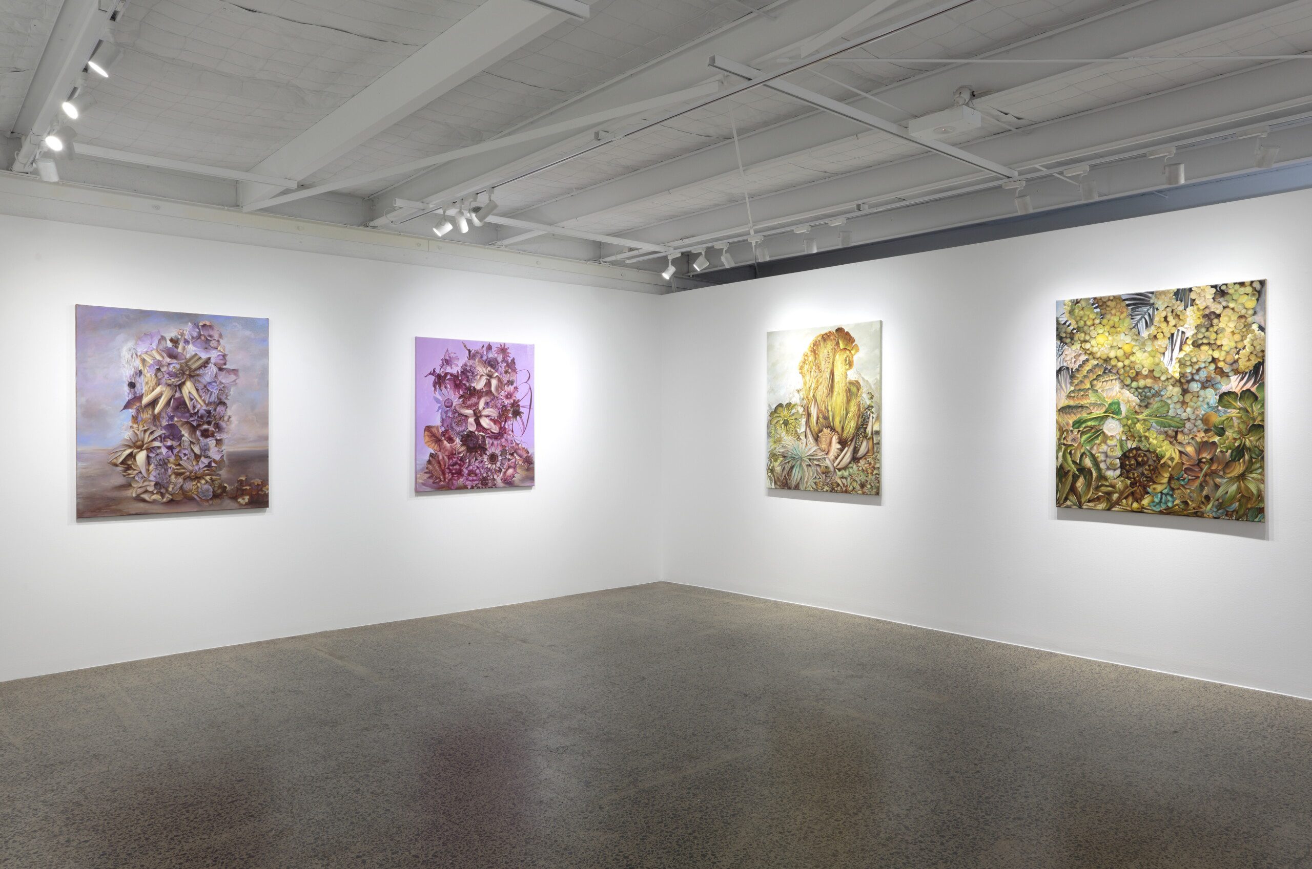 Here I paint complex entanglements of multi-genus flora in hyper-natural, Post-Humanist scenes. In reimagined ecosystems non-human subjects are presented as heroic and embodied with agency. Conflating laws of time, biology and chemistry, these non-human protagonists display a potential for infinite adaptation, mutation and hybridity. They blend existing and fantastical botanical species within landscapes unsettled by the forces of eerie weather phenomena. Picture the convergence of desert and oceanic landscapes, tidal expanses and alpine summits, all overgrowing the remnants of a bygone anthropocentric world. In their place, new organic monuments rise.