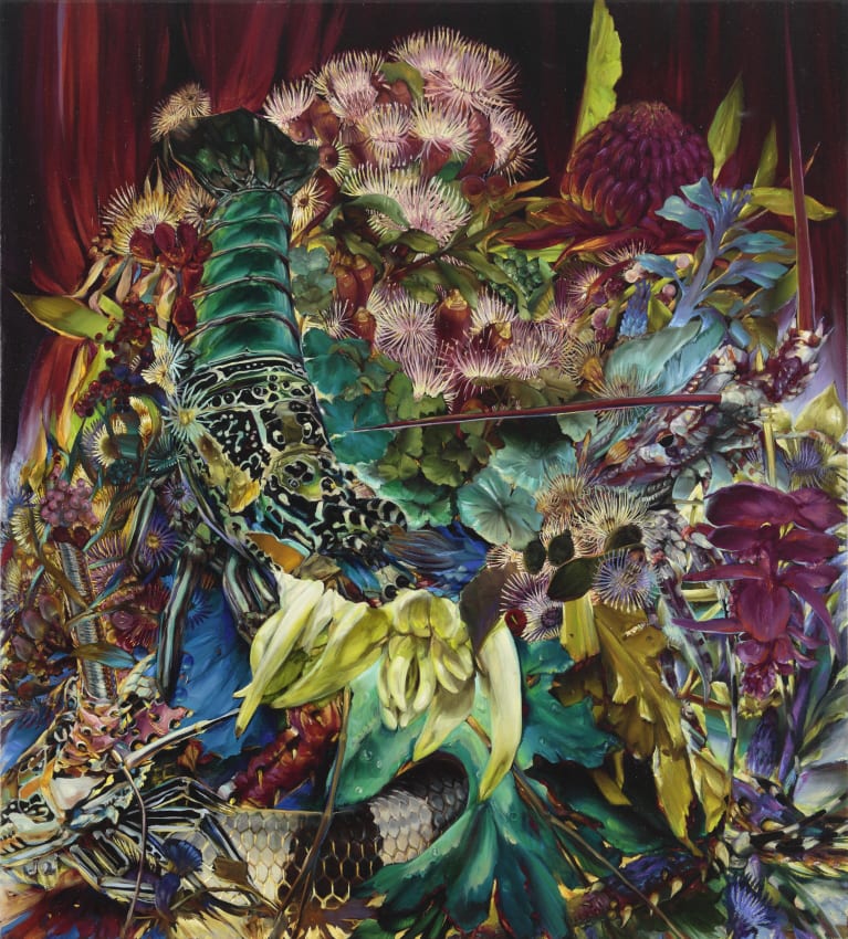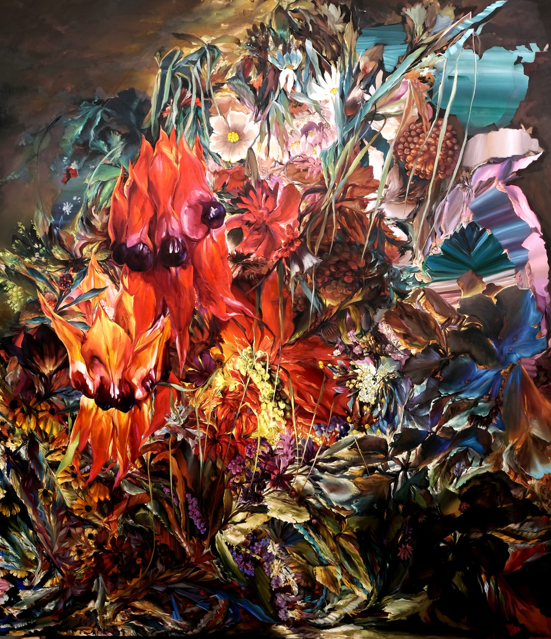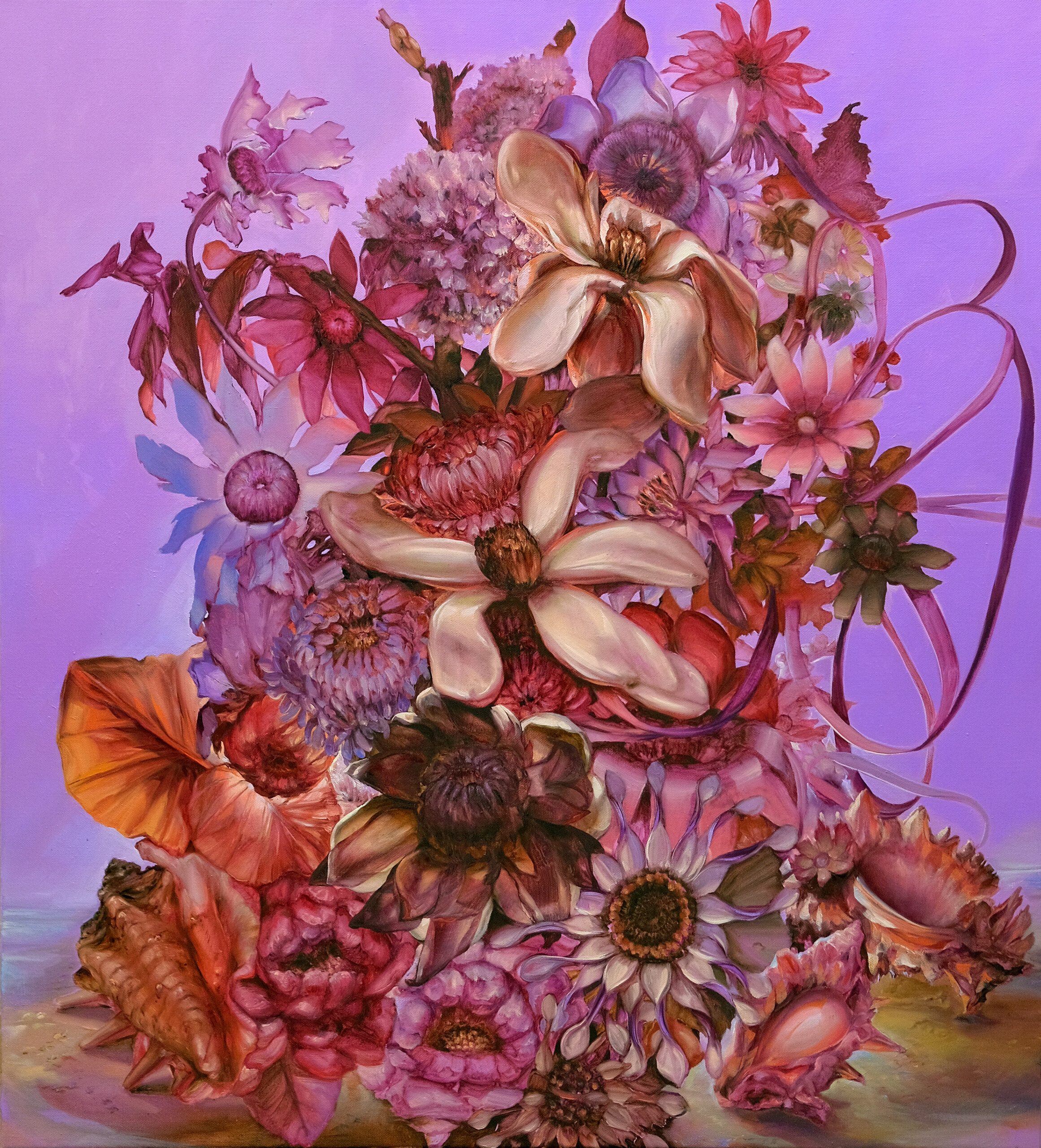 Through an art historical lens, my work refracts the socio-cultural anxieties of our age, critiquing what it means to be human at this present moment, under conditions of late capitalism and Anthropocentrism. Here I interweave allegoric deconstruction of ideological systems with autobiography, pathos and humour. In recent years I’ve been drawn to the ‘Impossible Bouquet’ popularised in 17th century Dutch Still Life painting. Secular merchants championed this genre, where every bloom is unseasonably bountiful: A simulacrum of nature. I am attracted to its symbolic ability to stand in for market-capitalism and Western worldviews.