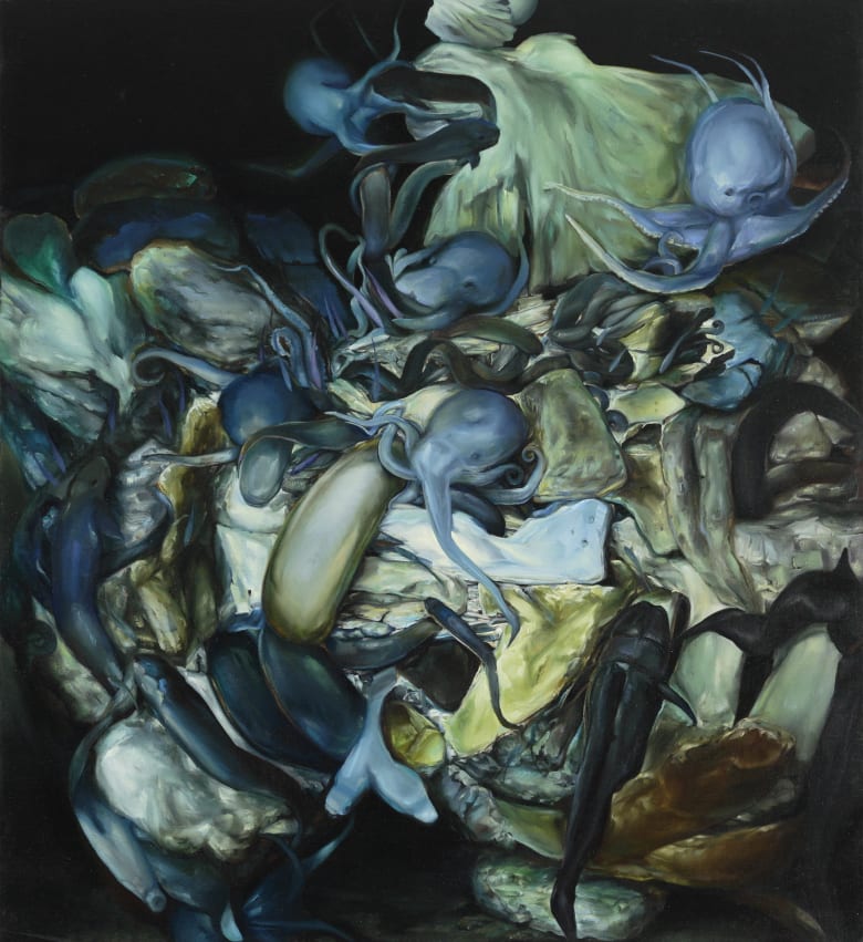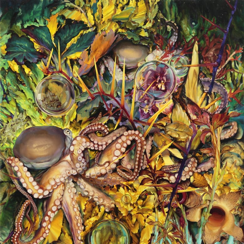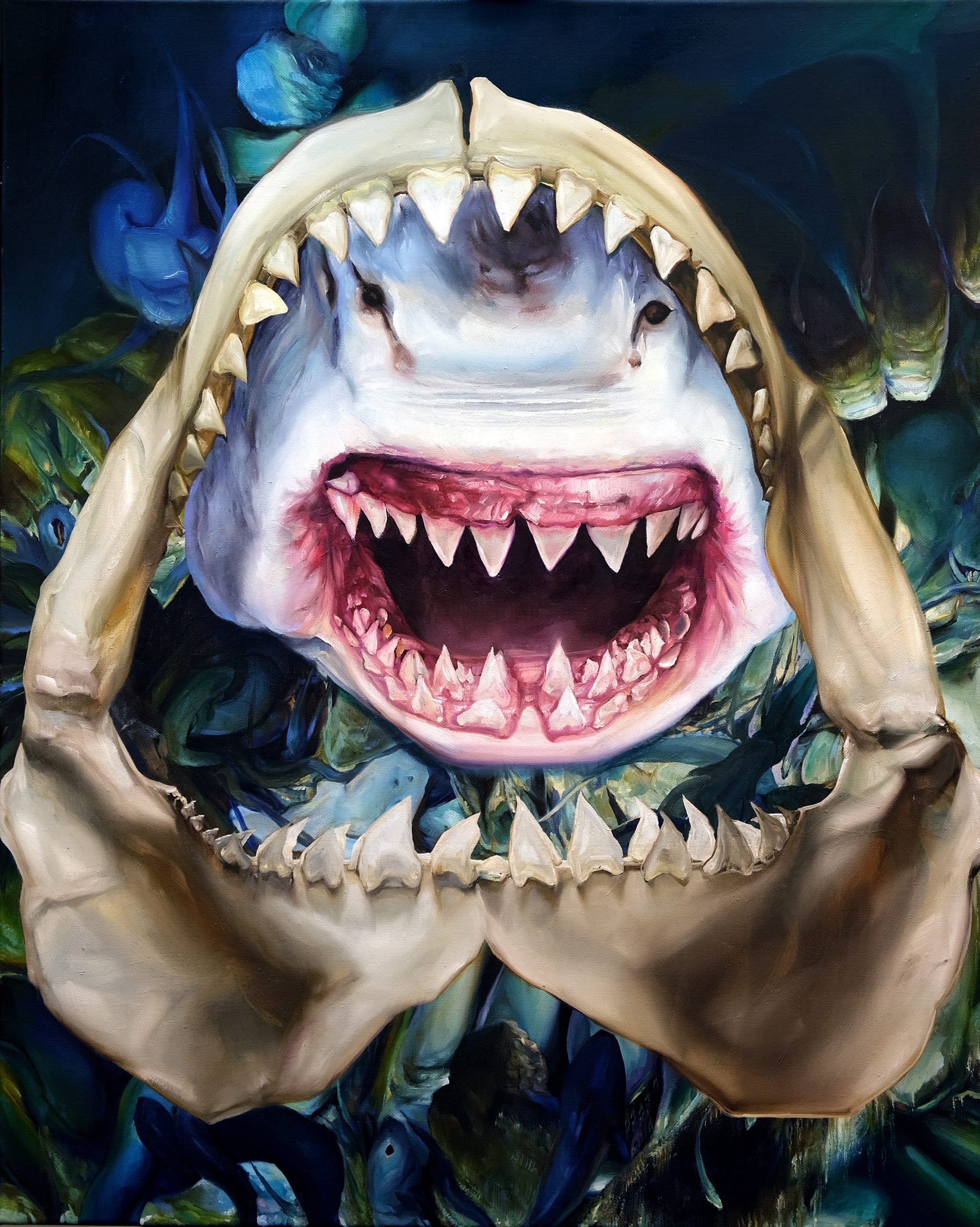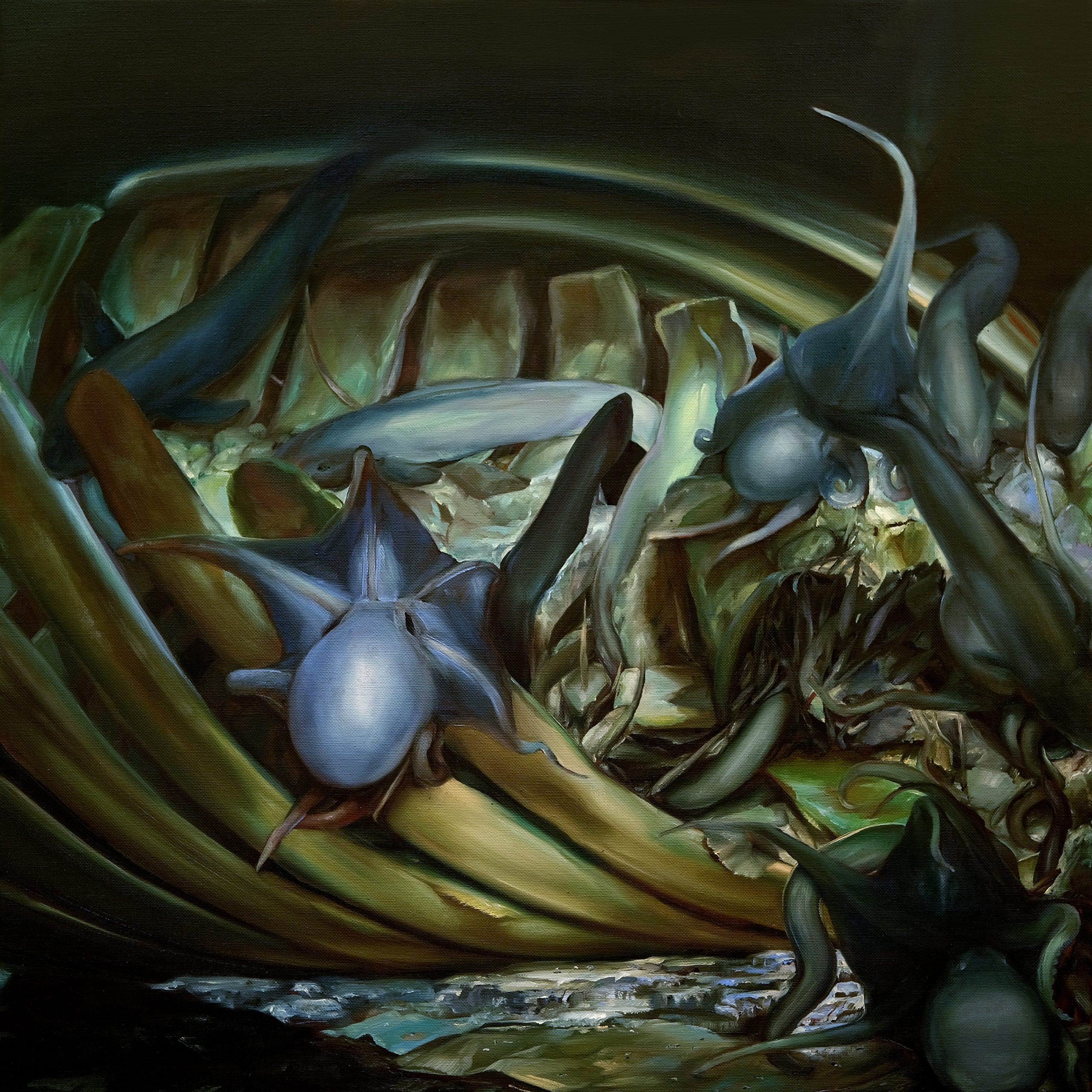 With an air of affirmative nihilism and a playful aesthetic of excess, Sugar Fever Dream is a counter vision to Western thought at the height of anthropocentrism. In a waking nightmare of interspecies revenge, this collection draws 17th century Still Life and Vanitas traditions into a Contemporary post-internet landscape. Employing Ecohorror tropes, Art Historical references, semiotic and autobiographical elements, the Still Lifes pulse with life. Nonhuman entities are protagonists embodied with agency, movement, menace and desire: from the skies of the heavens to the depths of the ocean floor.