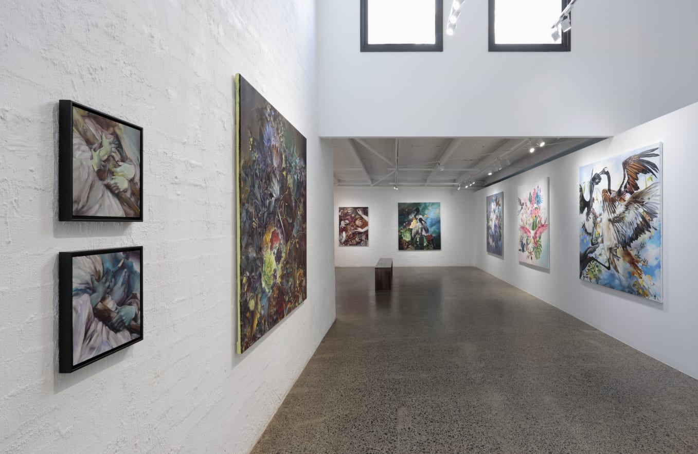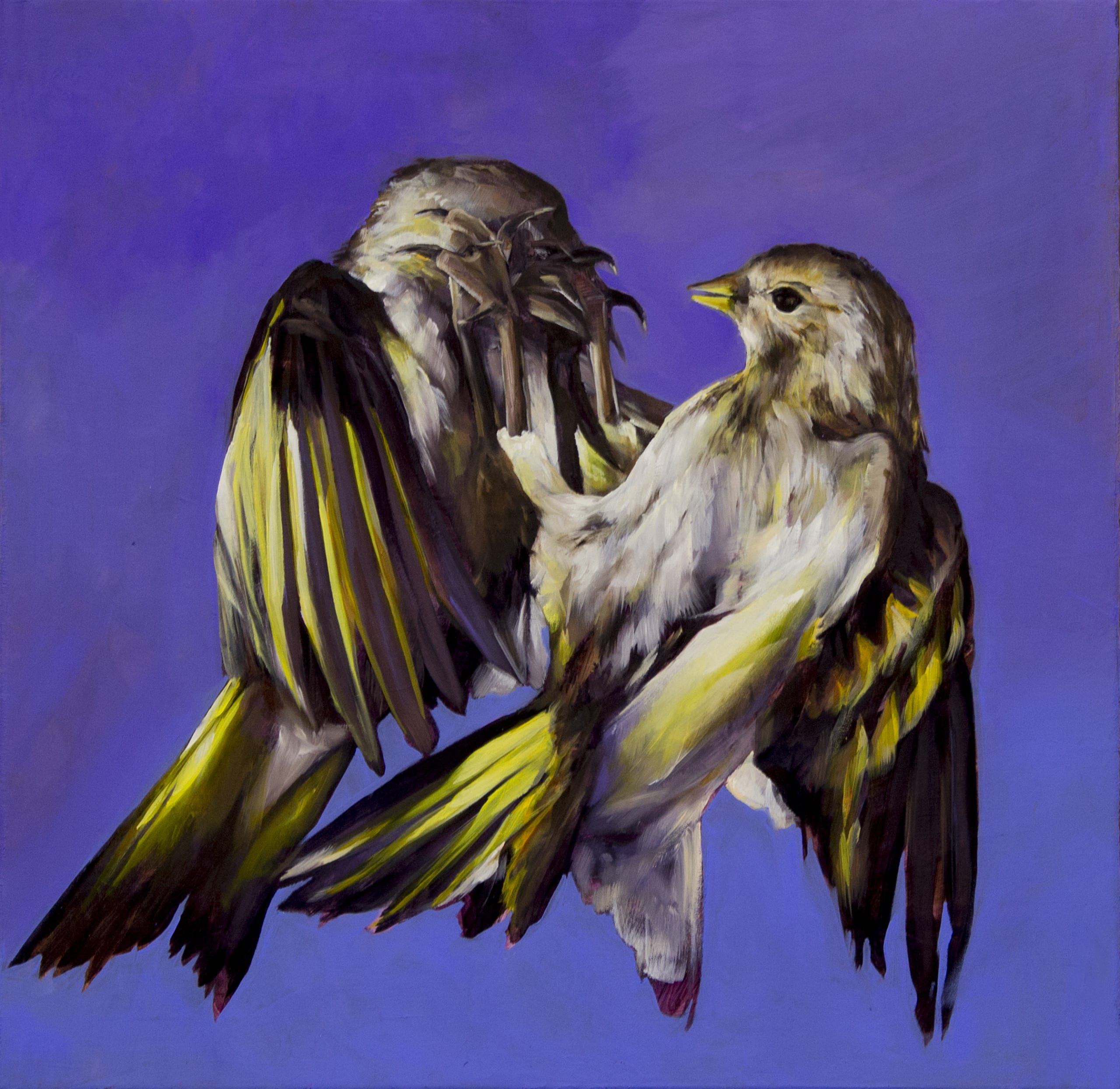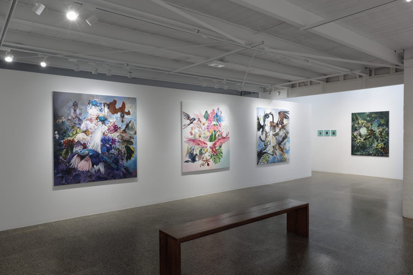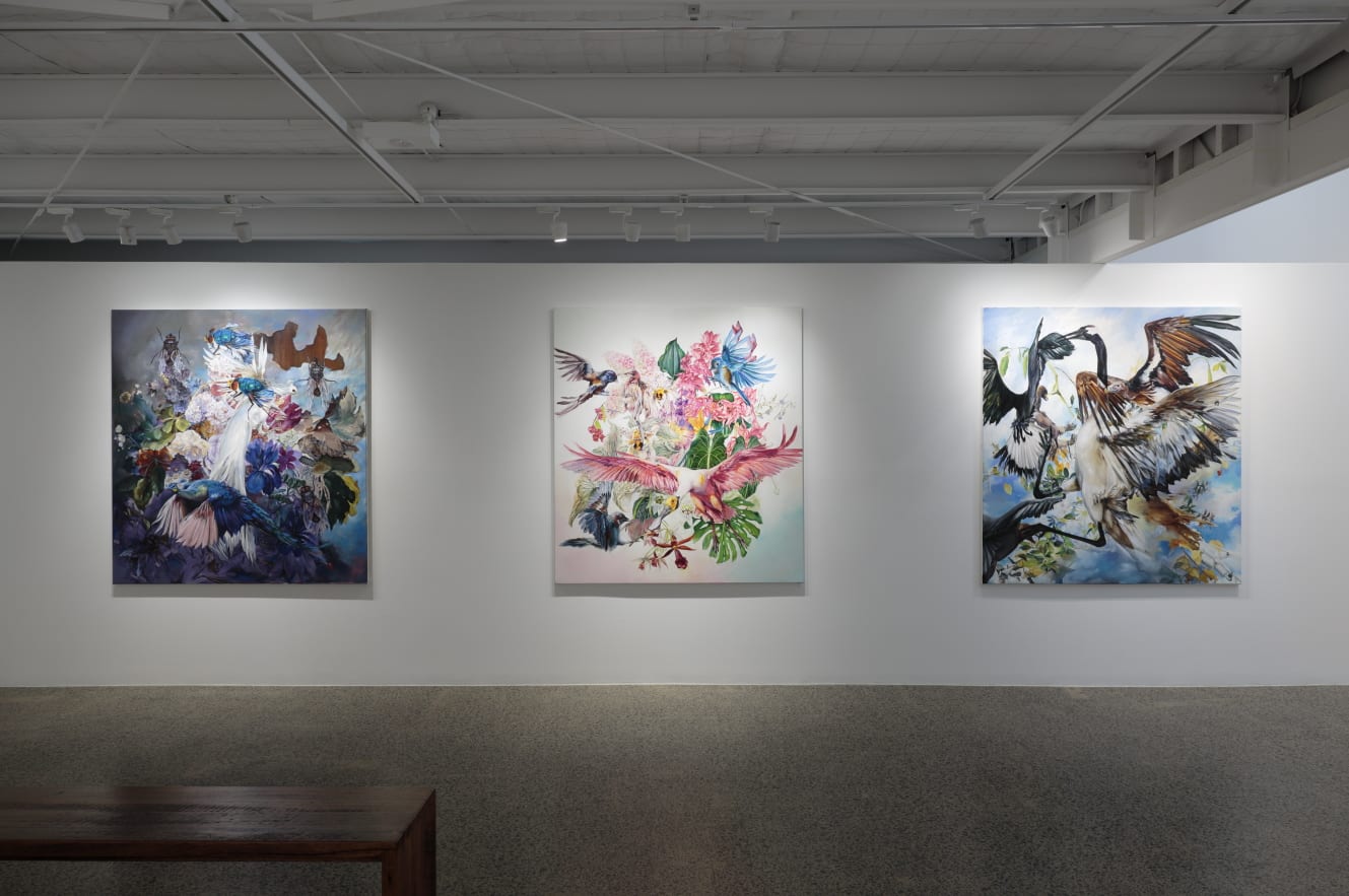 In continuation, To proceed within a trap (Nicholas Thompson Gallery, 2019) considers how we govern ourselves within a system of our own creation, constrained by personal beliefs, social mores and broader opaque ideological structures. Interrogating how our desires, anxieties and fears frame perceptions of reality this collection presents a range of psychologically laden mise-en-scenes set within a highly-aesthetic schema. Here themes of autobiography, psychology and sexuality; death and temporality; cultural constructs and geo-politics are traversed with playful irreverence and pathos. Chromatically saturated vistas and kitsch floral bouquets are depicted flanked by nightmarish swarms of birds watching menacingly or violently attacking mid-air. Depicting scenes of fraught fantastical projection this series draws on Hitchcockian horror tropes and signifiers referring to psychotherapeutic diagnosis, catholic-guilt and body-scrutiny, thereby touching on contemporary preoccupations with self-analysis and self-consciousness. Wherein works such as Guard Post and Wings of Desire, speak to an internalised anxious imagination paintings such as Freedom Fighters and Half Life broach broader subjects such as geo-political instability, surveillance and the universality of life and death.