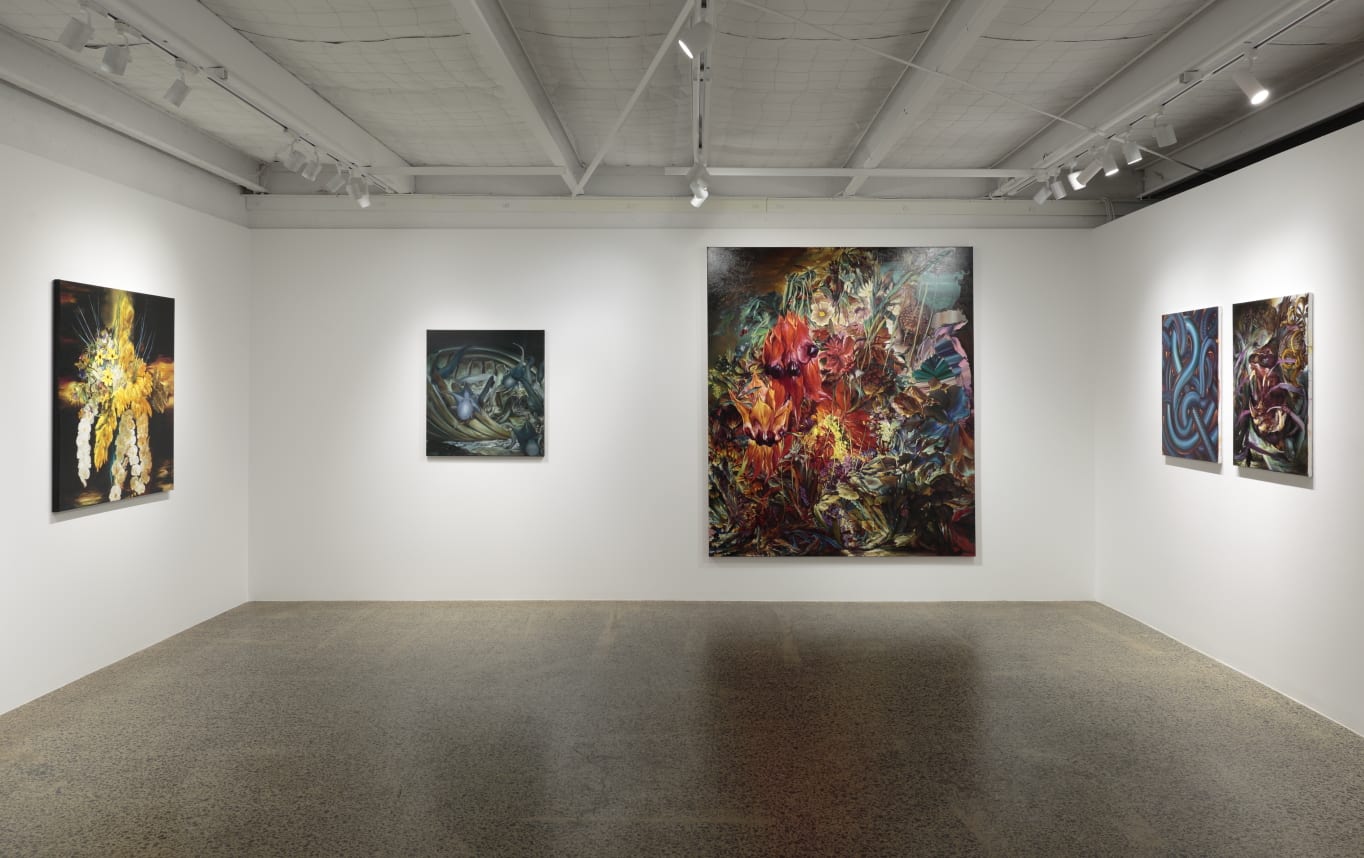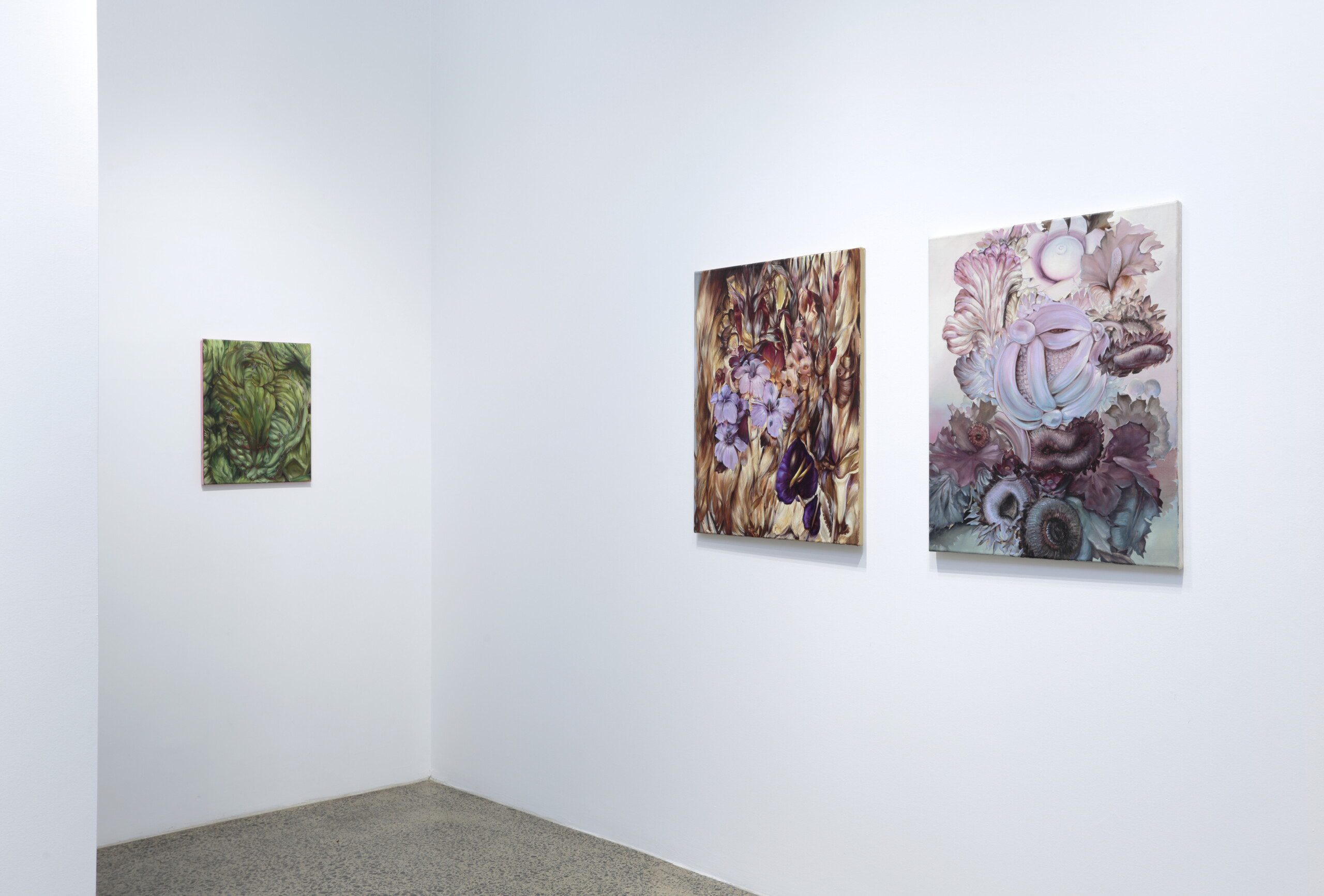 Within the tremendous visual power of her flora paintings, their vivacity and particularity, Karla Marchesi gives us nature in all its beauty and potential monstrosity. Across 14 oil paintings, the Berlin-based, Brisbane-born artist has created still life floral scenes that have the uncanny shock of a dream. They are delightful but also skewed and mutating. Across a hazy pastel background (Marchesi is a master of using colour to convey a strange sense of weather) is a monumental amalgamation of flowers, petals and leaves. Other paintings depict sprouting growths akin to coral; delicate pansy-like flowers in powerful orange and green-tinged succulents that expand across the canvas. Marchesi is partly referencing the ‘‘impossible bouquet’’ of 17th-century Dutch painting that featured fantastical floral arrangements that could never occur in nature. It seems timely – both hopeful and melancholic – to resurrect this genre. Marchesi shows how nature has its own forms of creation beyond humans, conveying how mighty and inventive this is.