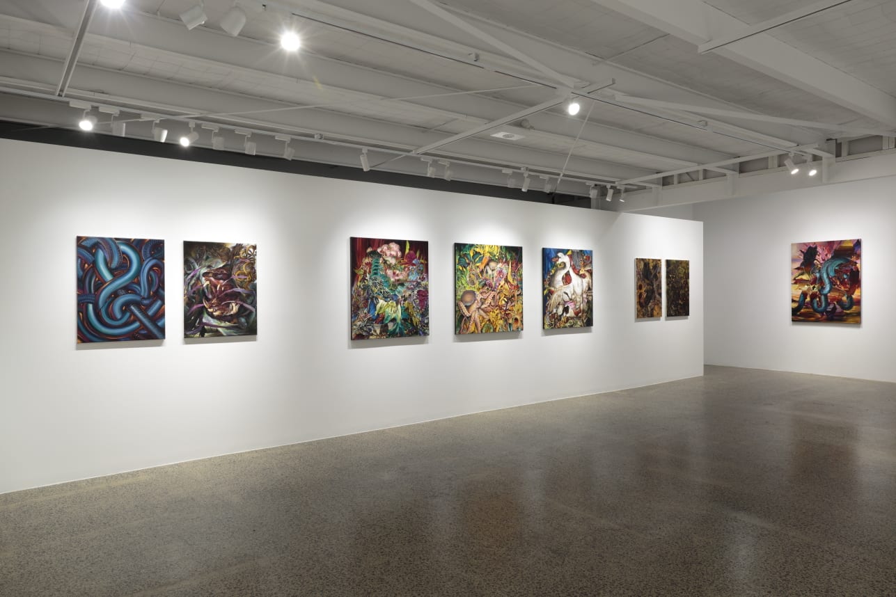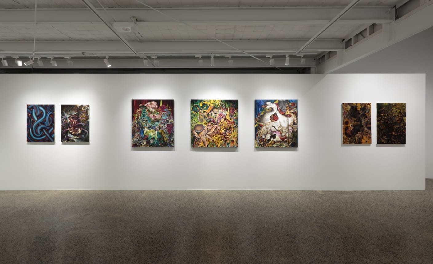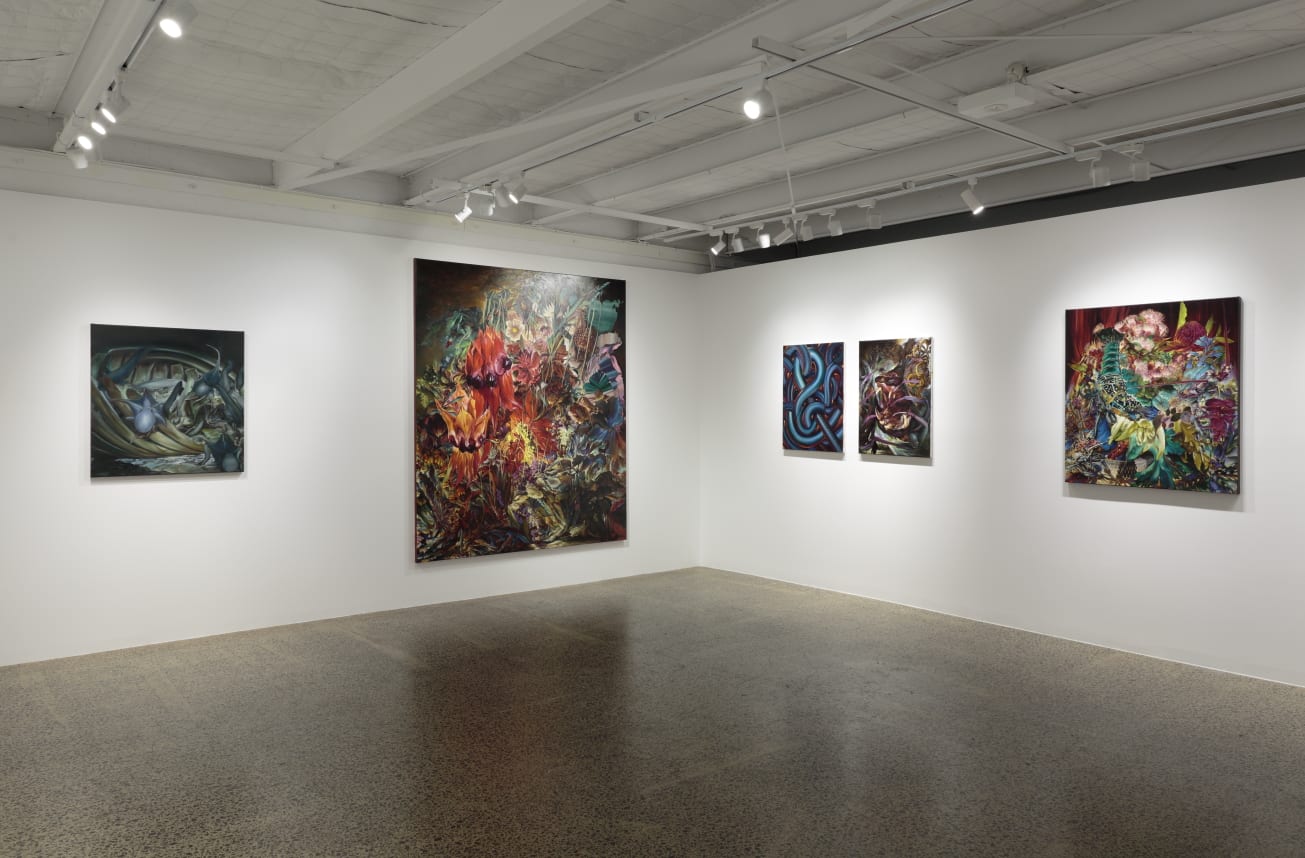 Sugar Fever Dream presents a range of hyper-natural Post-Humanist landscapes. These paintings are bowls of brightly wrapped candy, offering enticement on first glance, but may induce nausea if consumed in totality.
