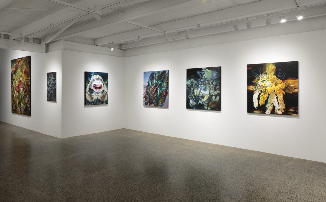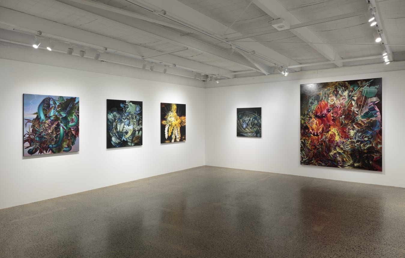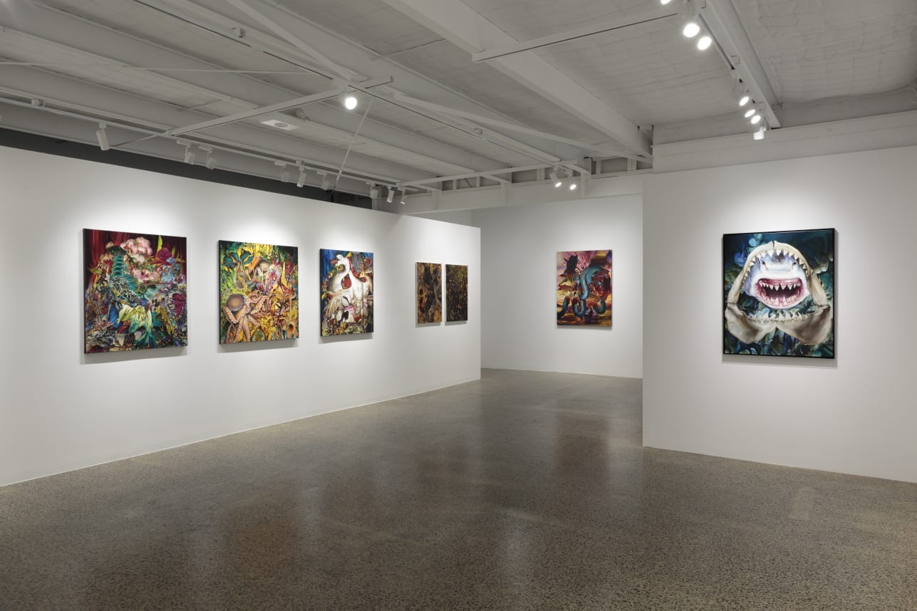 Sugar Fever Dream presents a range of hyper-natural Post-Humanist landscapes. These paintings are bowls of brightly wrapped candy, offering enticement on first glance, but may induce nausea if consumed in totality.