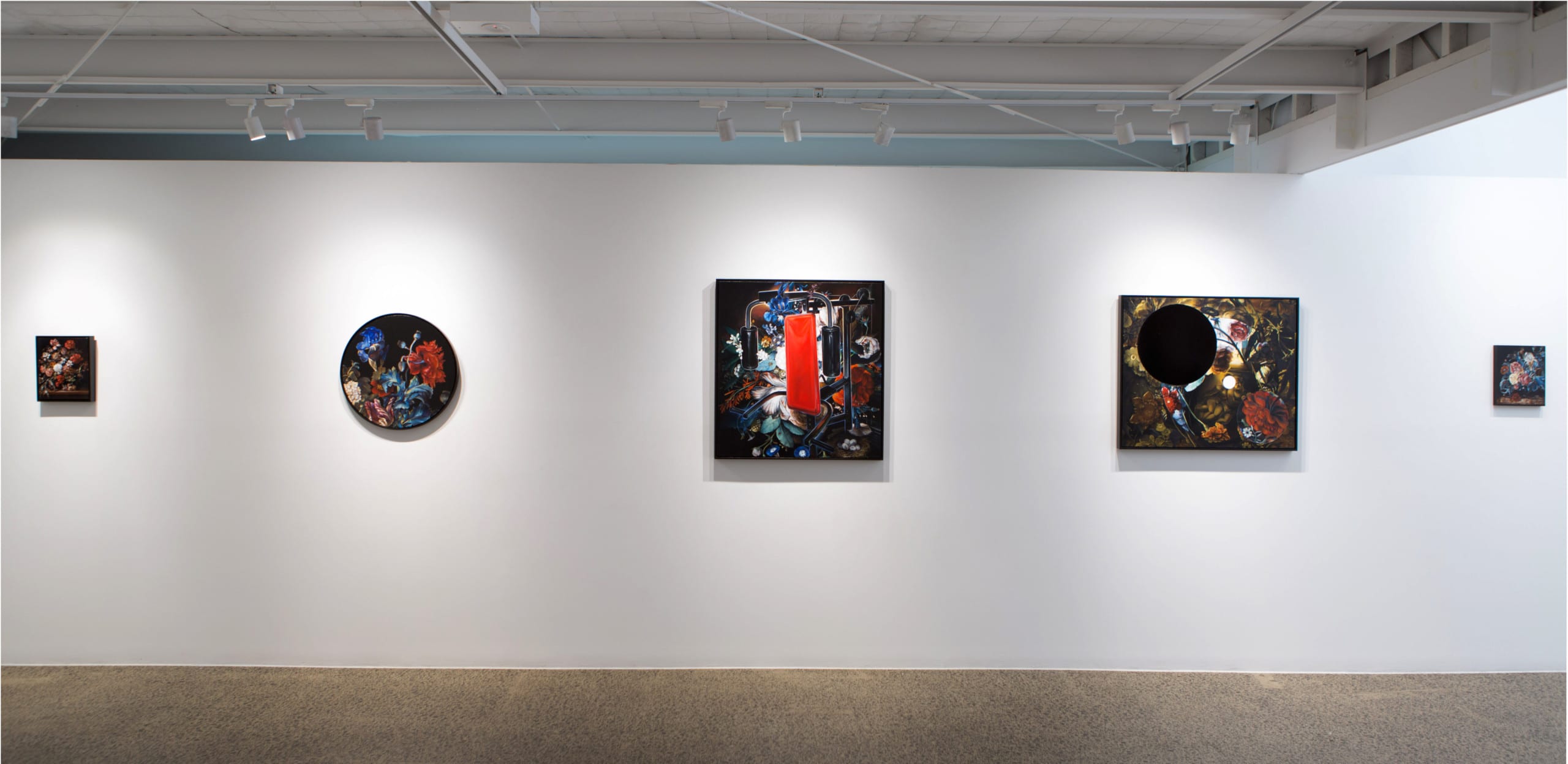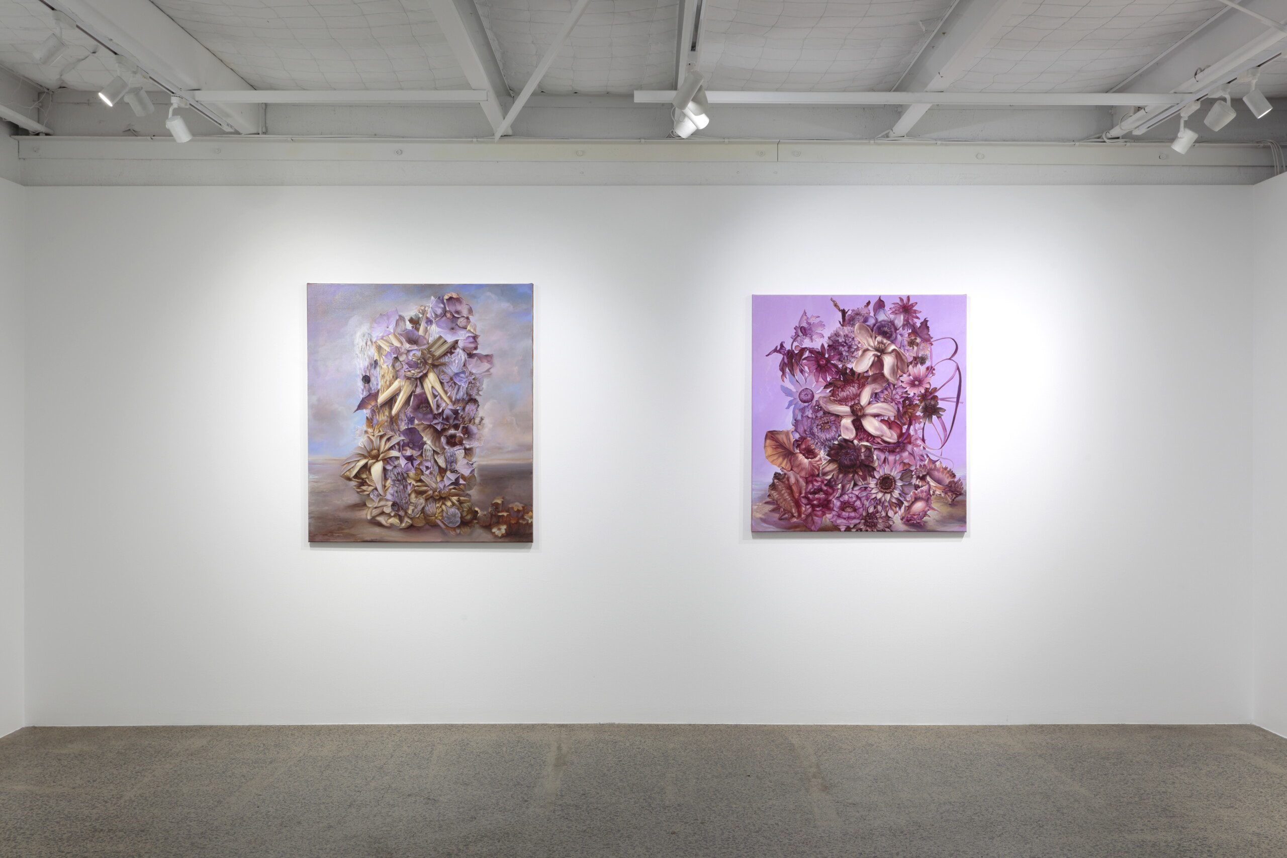 Provoked by the Vanitas dictum, Vanitas vanitatum omnia vanitas ("Vanity of vanities, all is vanity), early paintings from this series such as Vanity Fair (2016), Life goals (2016) and Tension meter (2016) feature superimposed gymnasium apparatus, chains and metal poles over representations of 17th century Dutch still lifes. These impossible bouquets, a culturally constructed arrangement wherein the flora depicted cannot bloom simultaneously, allude to bourgeoning middle-class wealth and the first manifestations of market capitalism. In this body of work such bouquets act as a stand in for the absurdity and constructedness of cultural suppositions; namely measures of achievement attained by the individual, whether they ascribe to conventional beauty standards, competitive success or wealth aspirations. The inorganic punctuations formally bisecting the background vegetation allude to the impossibility of fulfilling contemporary cultural dictates with an irreverent tragicomic humour.
