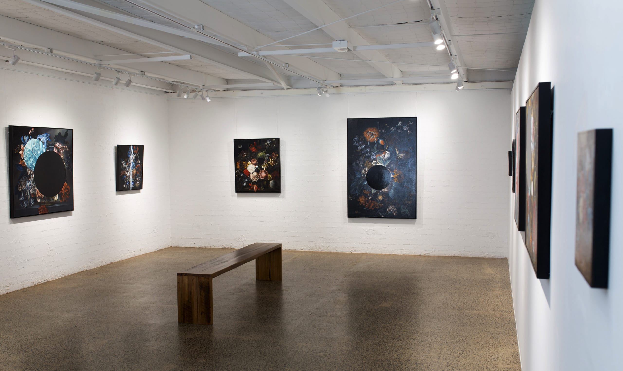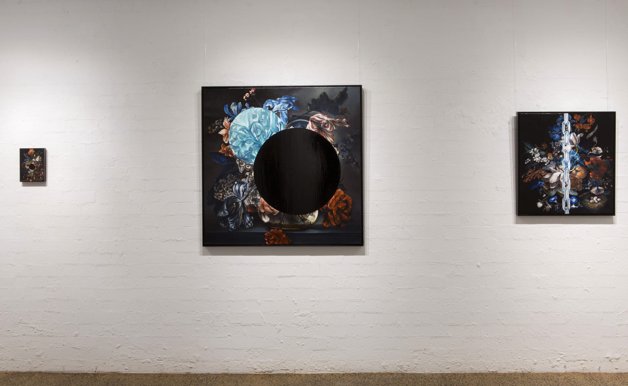 Works created in 2017 develop a language away from the myopia of individual experience contrarily adopting a hyperopic vision of human experience. Condensing past, present and future; nature, culture and universal death, motifs of circular voids, solar eclipses, celestial bodies and black holes punctuate these later works. Paintings such as The sense of an ending (2017), Deep space, small death (2017) and Eclipse (2017) present an atheistic Vanitas, with a quiet nihilist humour. Abridging the full spectrum of human experience in to three tenets, these works flout any reference to modernity and in doing so reflect on the absurdity of our current socio-cultural landscape and the temporality of our time.