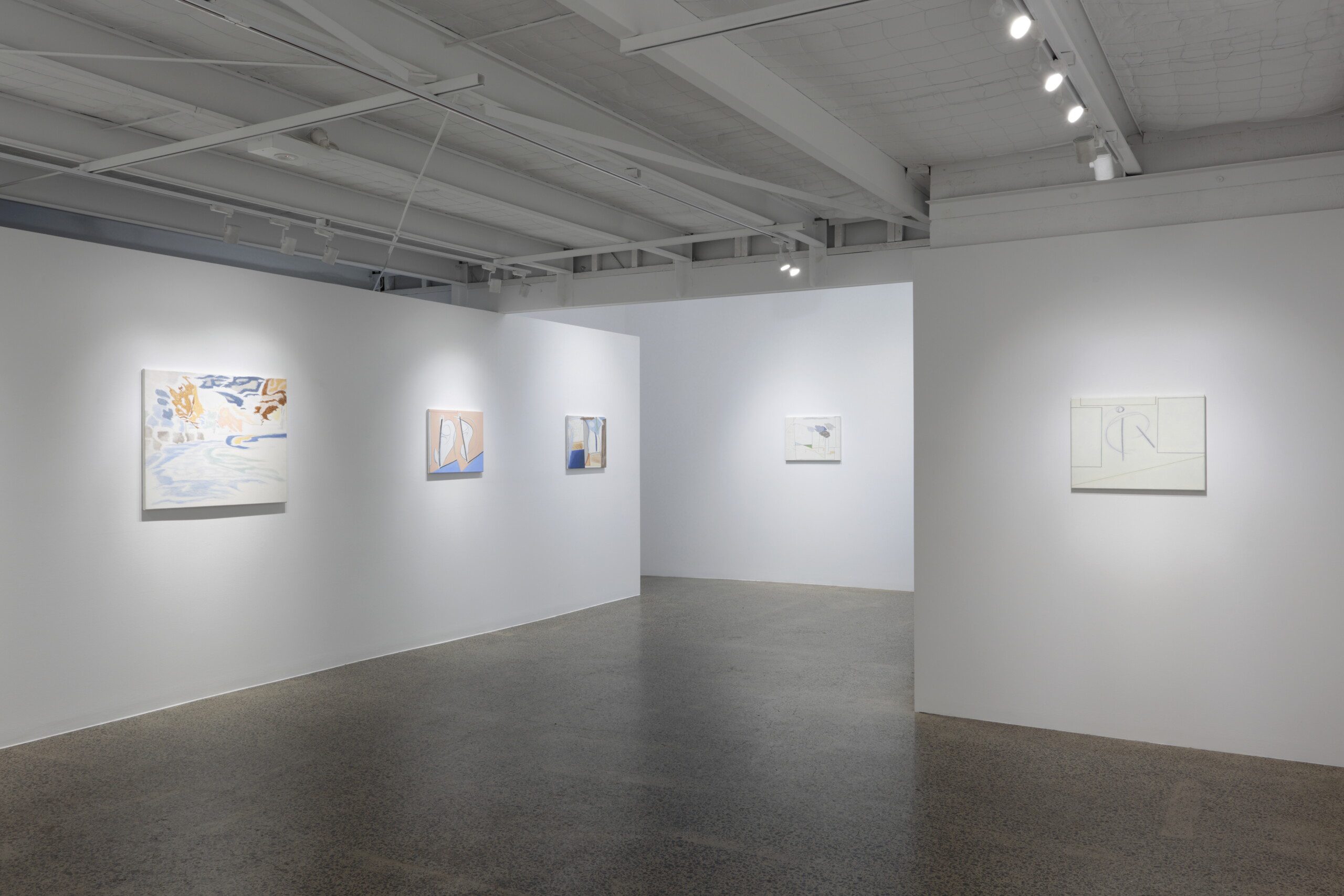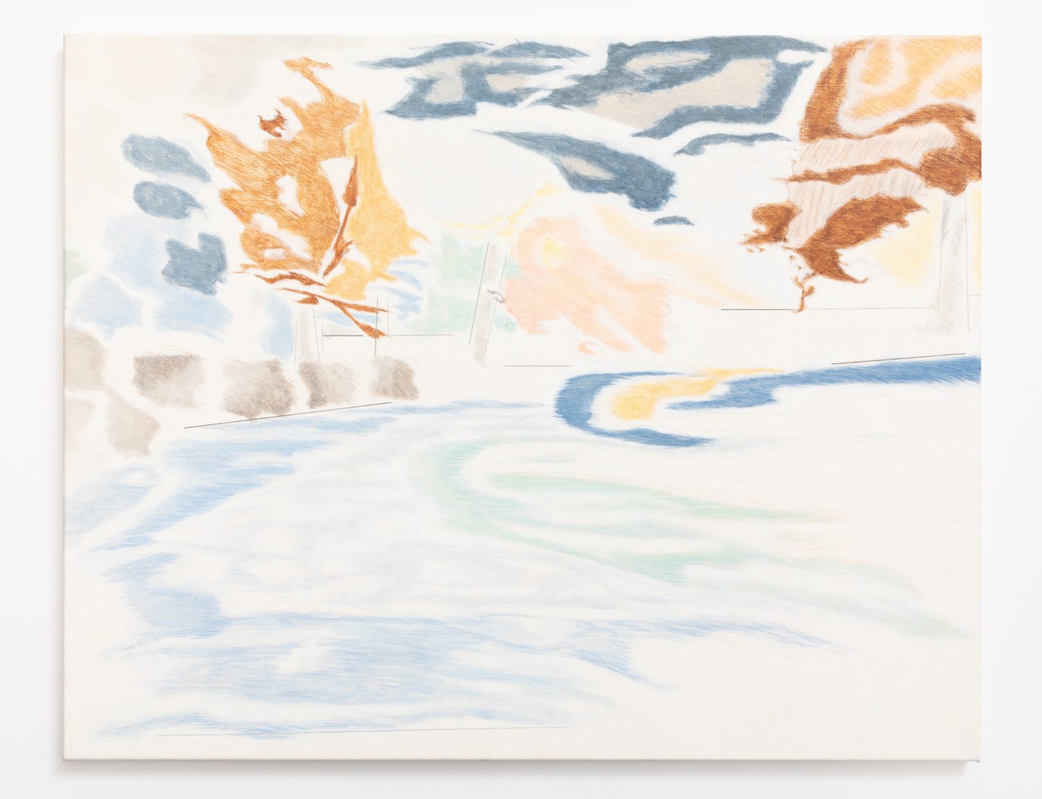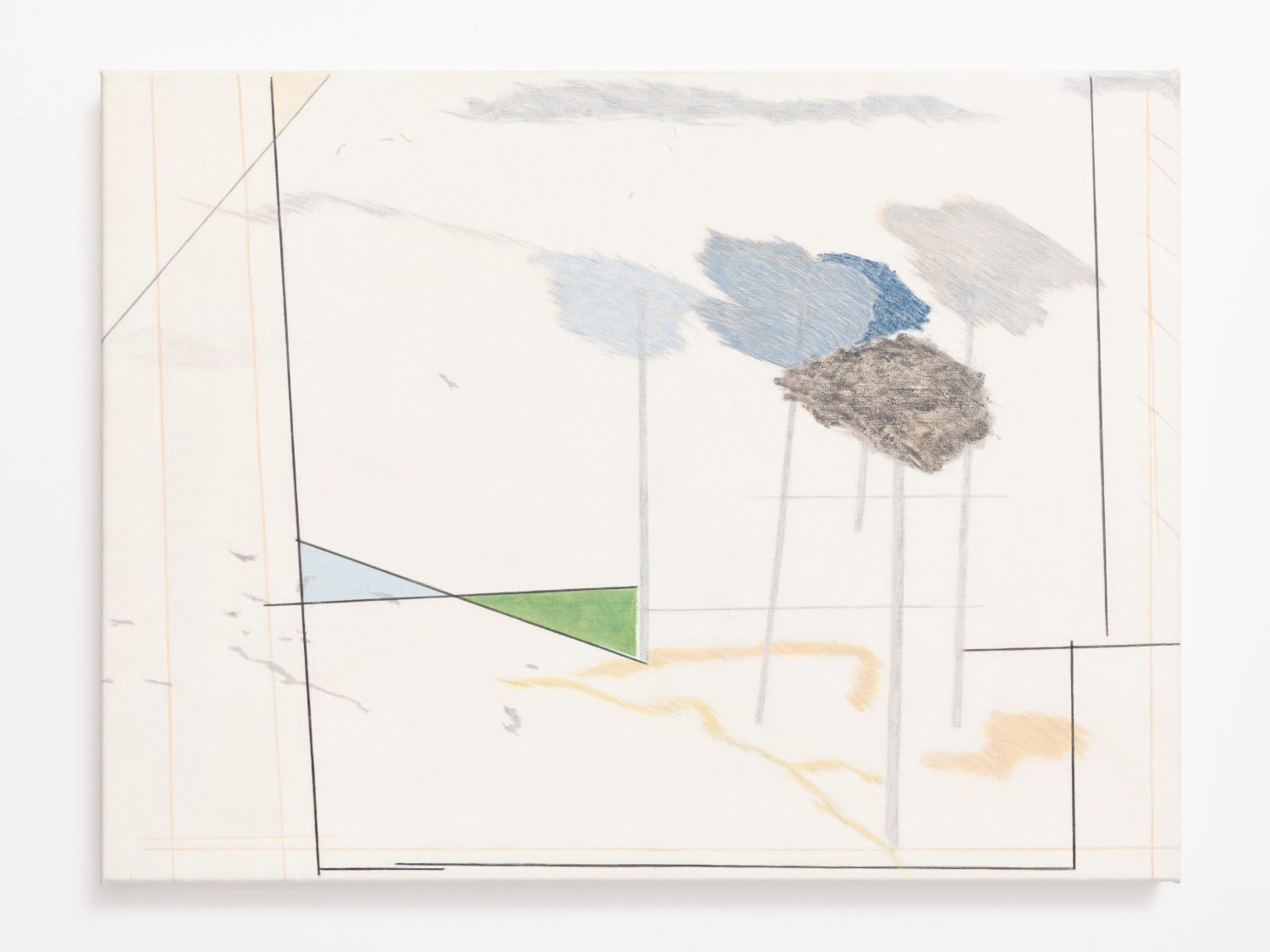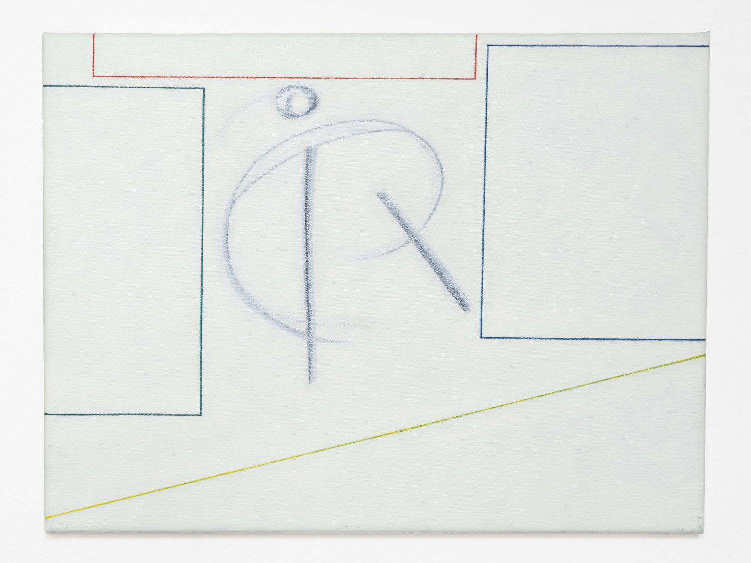 In Measuring the Wind, George’s paintings and drawings flex between structured and organic realities. Pale primaries, whites and multiple blues create buoyancy in his pictures, while paint is applied in a way that emulates soft pastels or other drawing materials. Pictorially, symbolic elements that reference human and non-human entities are used in various iterations. These elements are specific assemblages made of line and shape that the artist has developed and defined over time, and now appear repeatedly in his work.