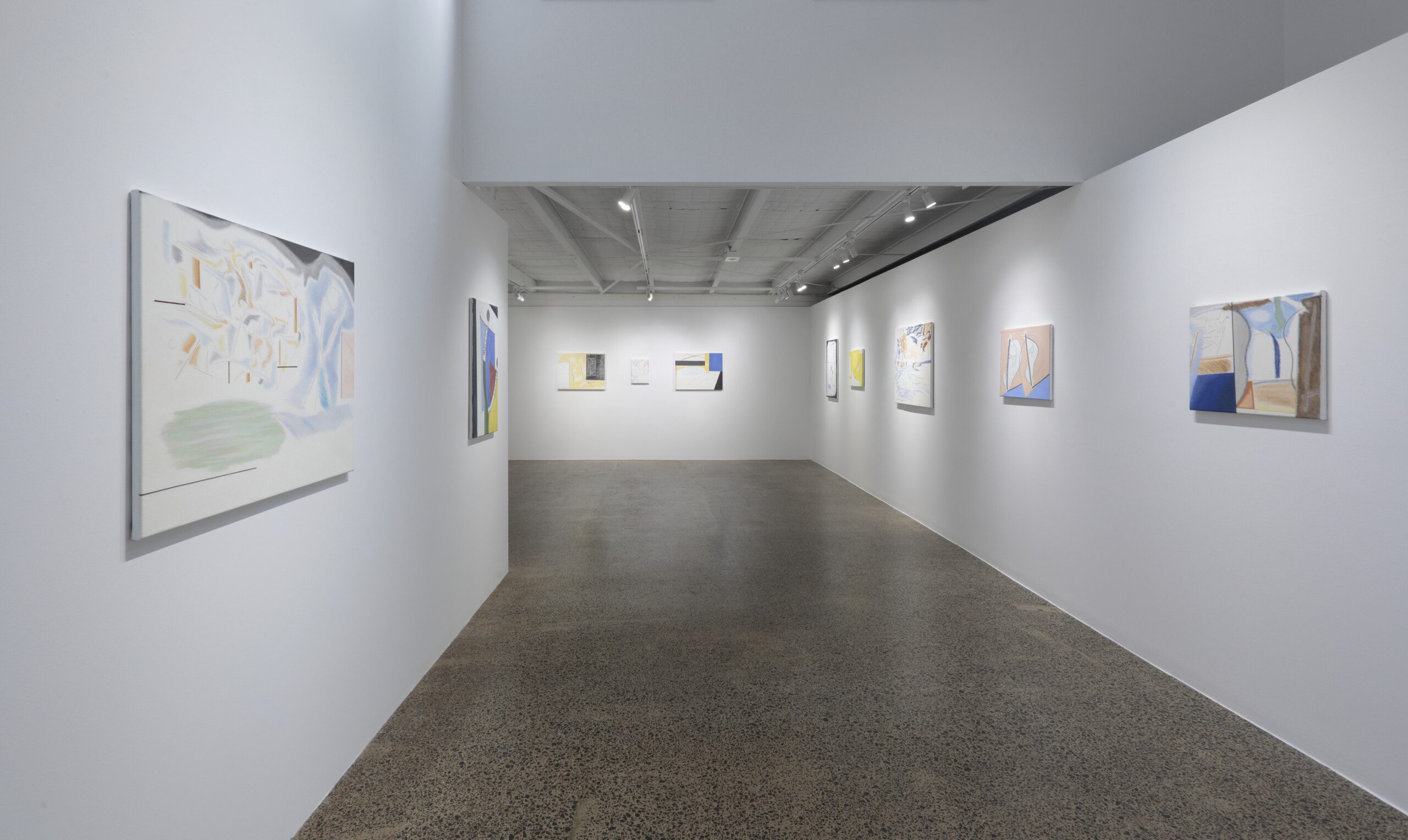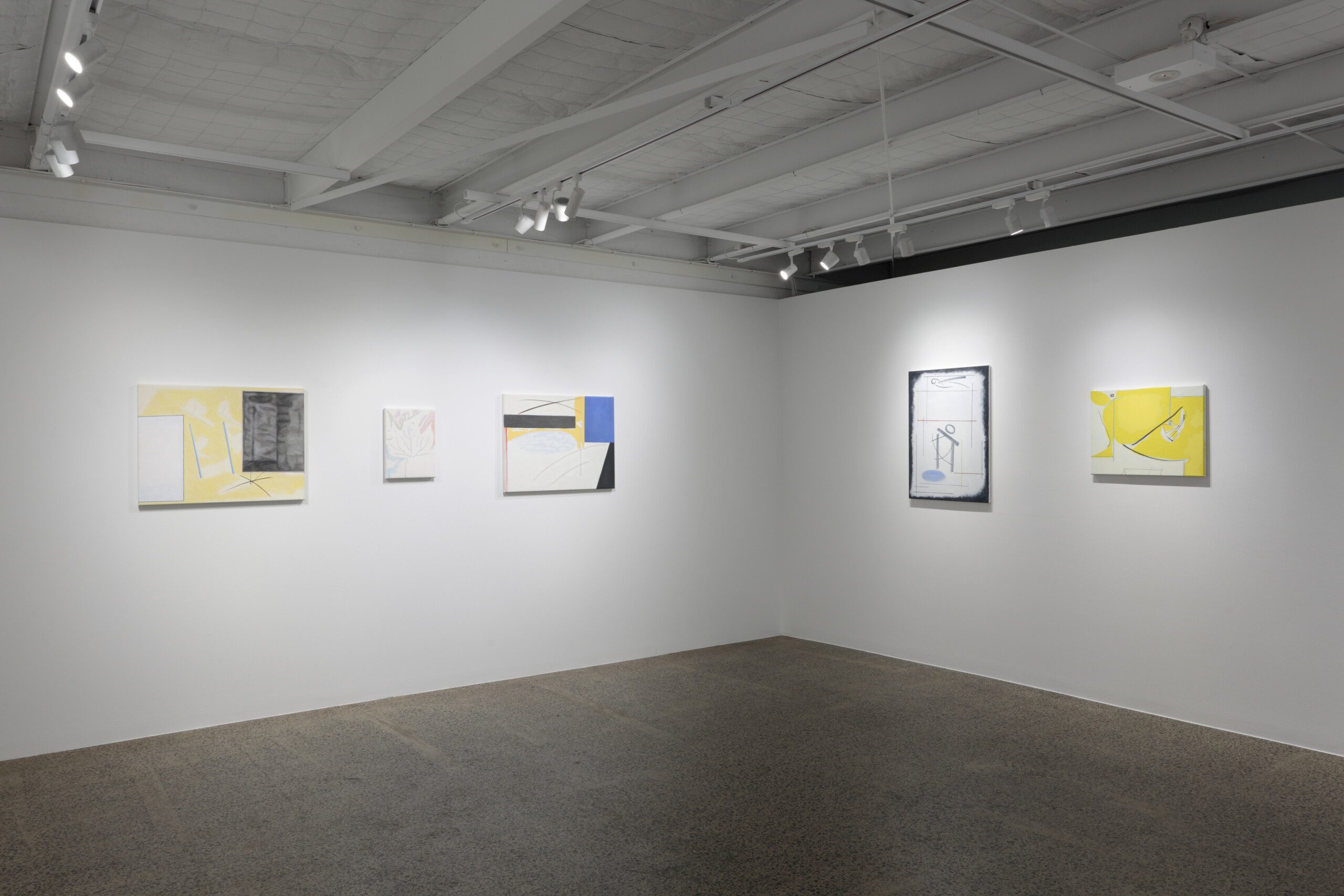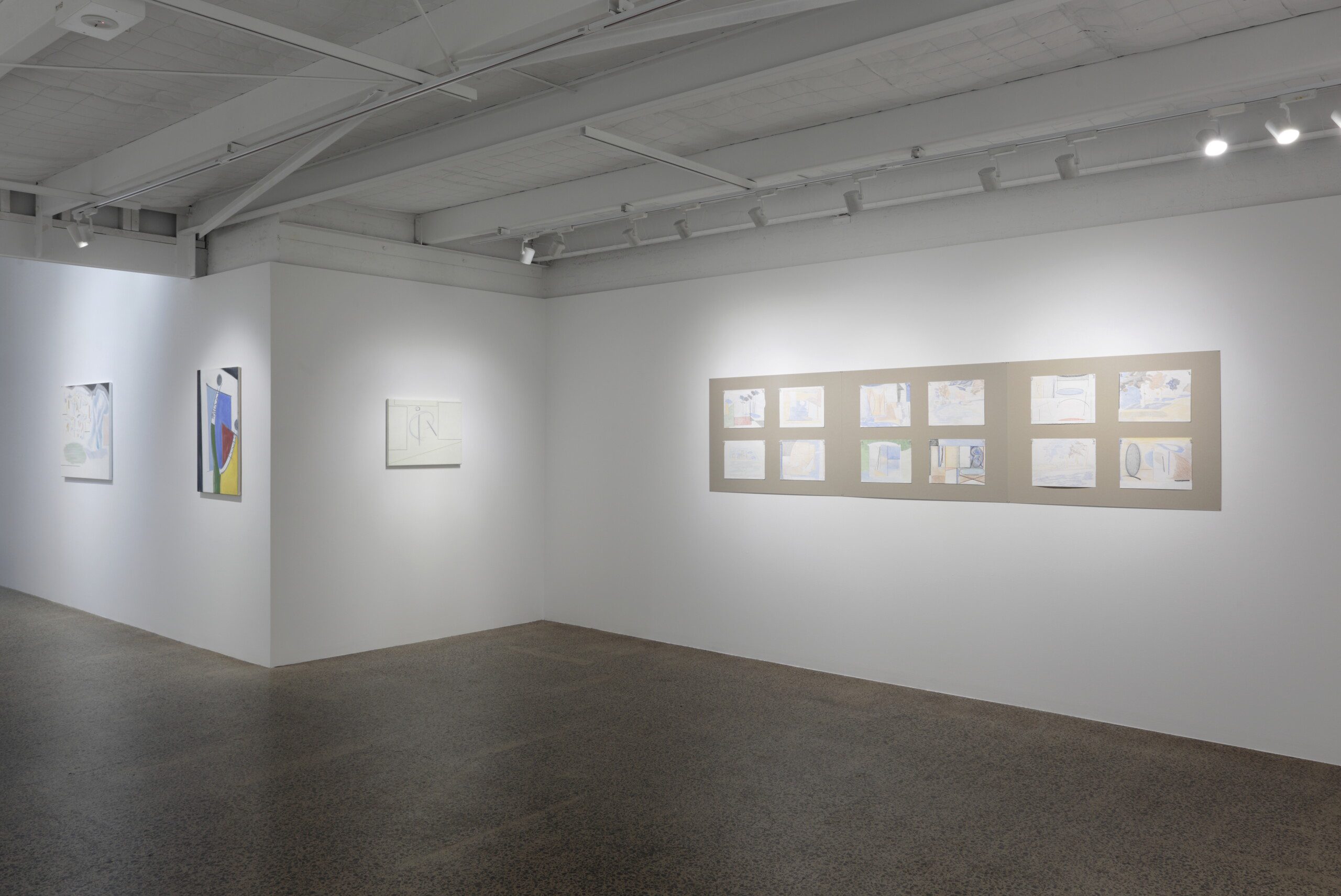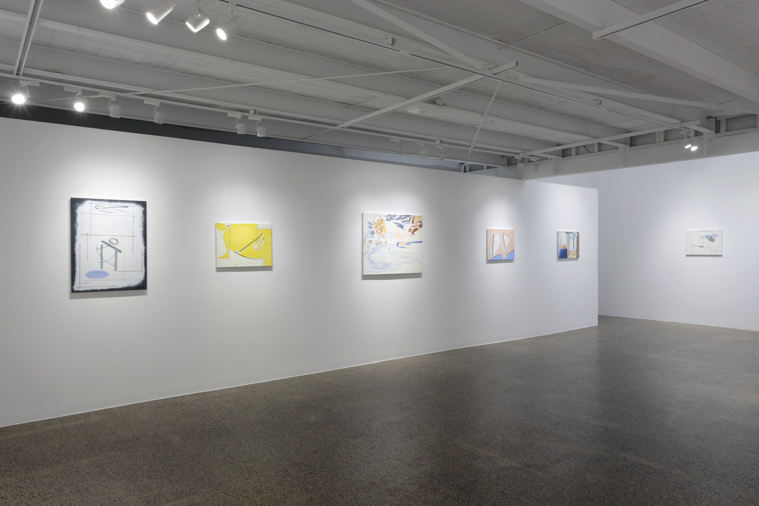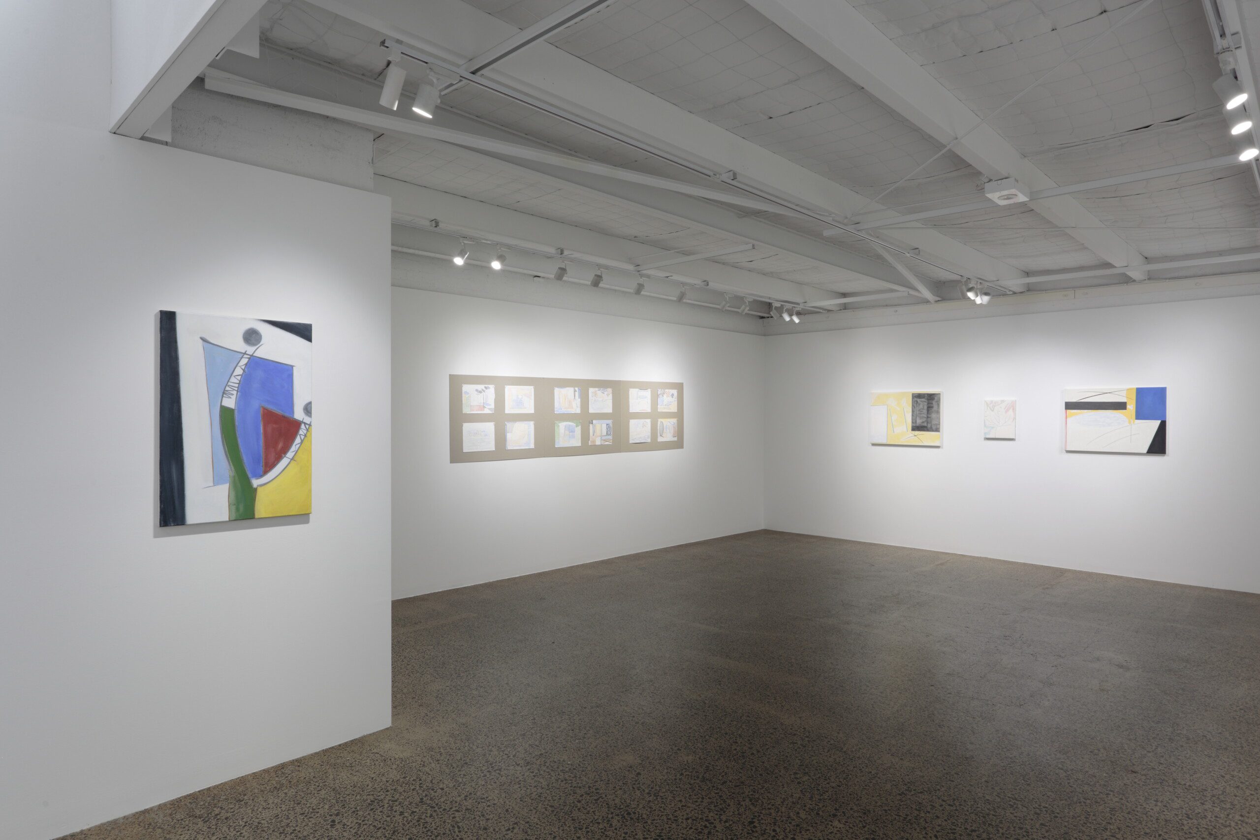 The negative space between the objects is also active; like in Didi-Huberman’s essay, it is an imaginary breeze. It is an accessory of motion that keeps everything flowing, so the elements can riff off one another but not really touch; autonomous subjects in intimate interaction. While “figure/head” might agitate the centre, “line/barriers” flanks the sides, and in combination they are lively. George’s interest in lyrical Modernism shows here—his pictures could be contemporaries to Klee’s dreamscapes, Kandinsky’s cosmoses or Mondrian’s harder abstractions—all of which are influences—with organic forms cavorting with geometries, sounding off against one another across the canvas and across the room.