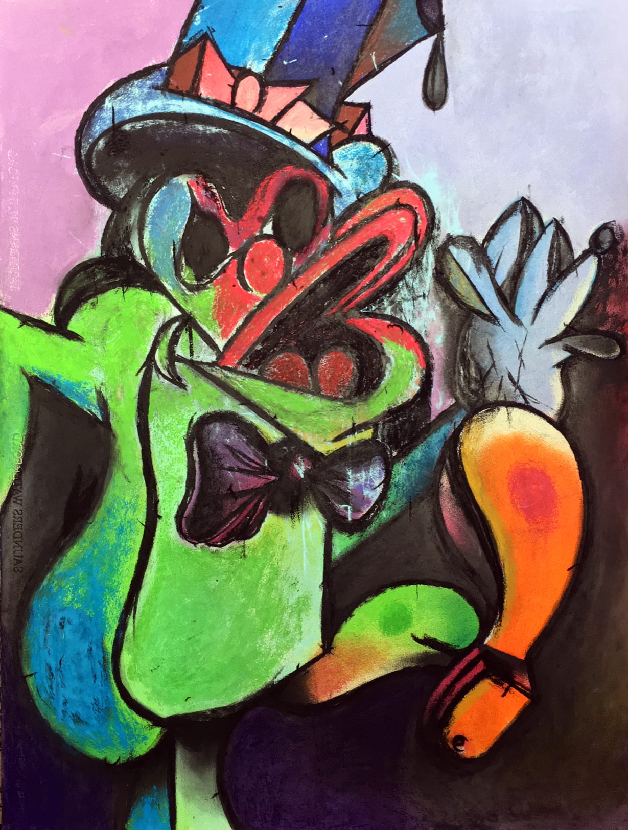 Alluding to his common thread, the artist explains how "The works in the show are connected through line and form, except Flip The Frog. I’ve been looking at Picasso and Condo a lot and I keep coming back to the cubist aesthetic. It takes me back to my graffiti-filled youth, with hard lines, shape, shadow, color, and mess." Lee's seamless blend of traditional art influences and equally classic graffiti elements results in raw pictures where process, surface, and texture are as important as content, most notably in pieces, such as The Juggler #4 or The Handler, in which Picasso-esque aesthetic is applied around Vaughn Bodē-like characters.