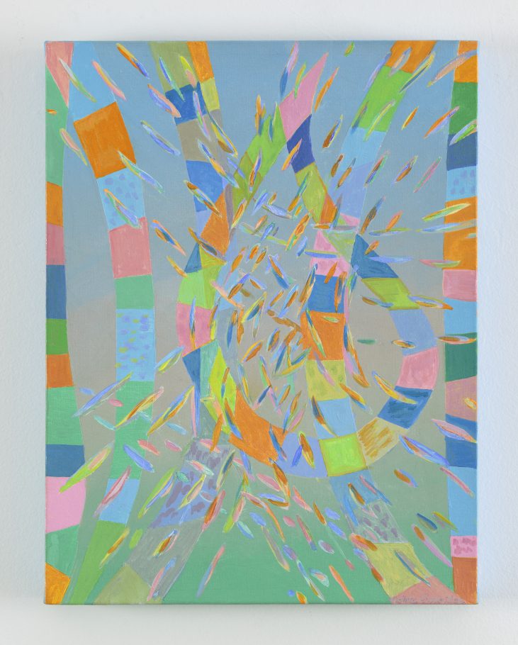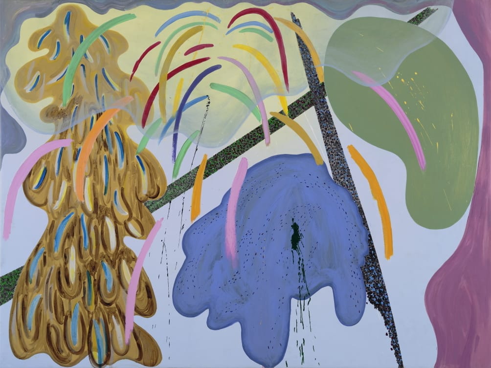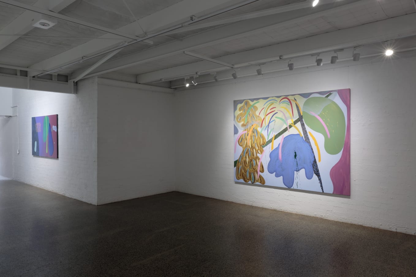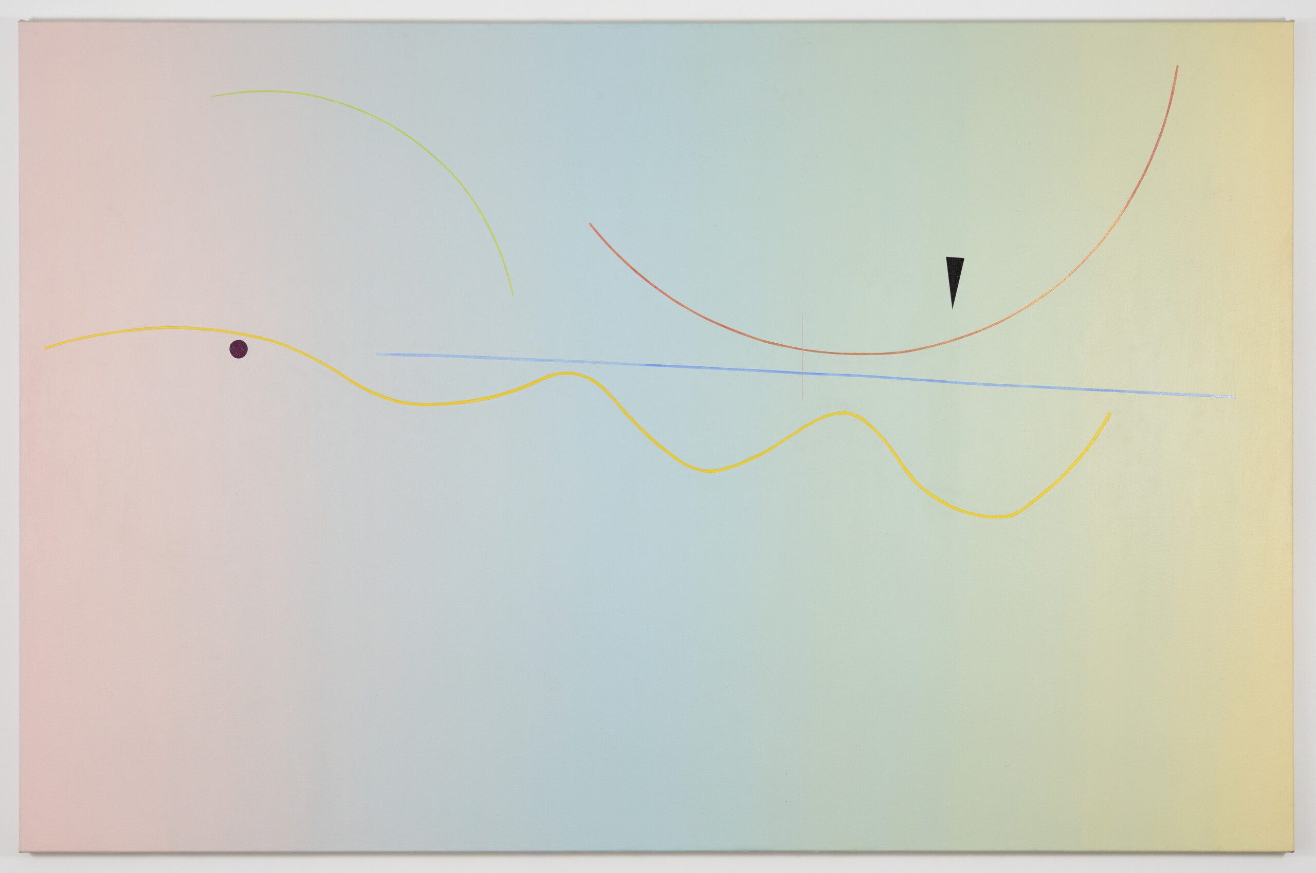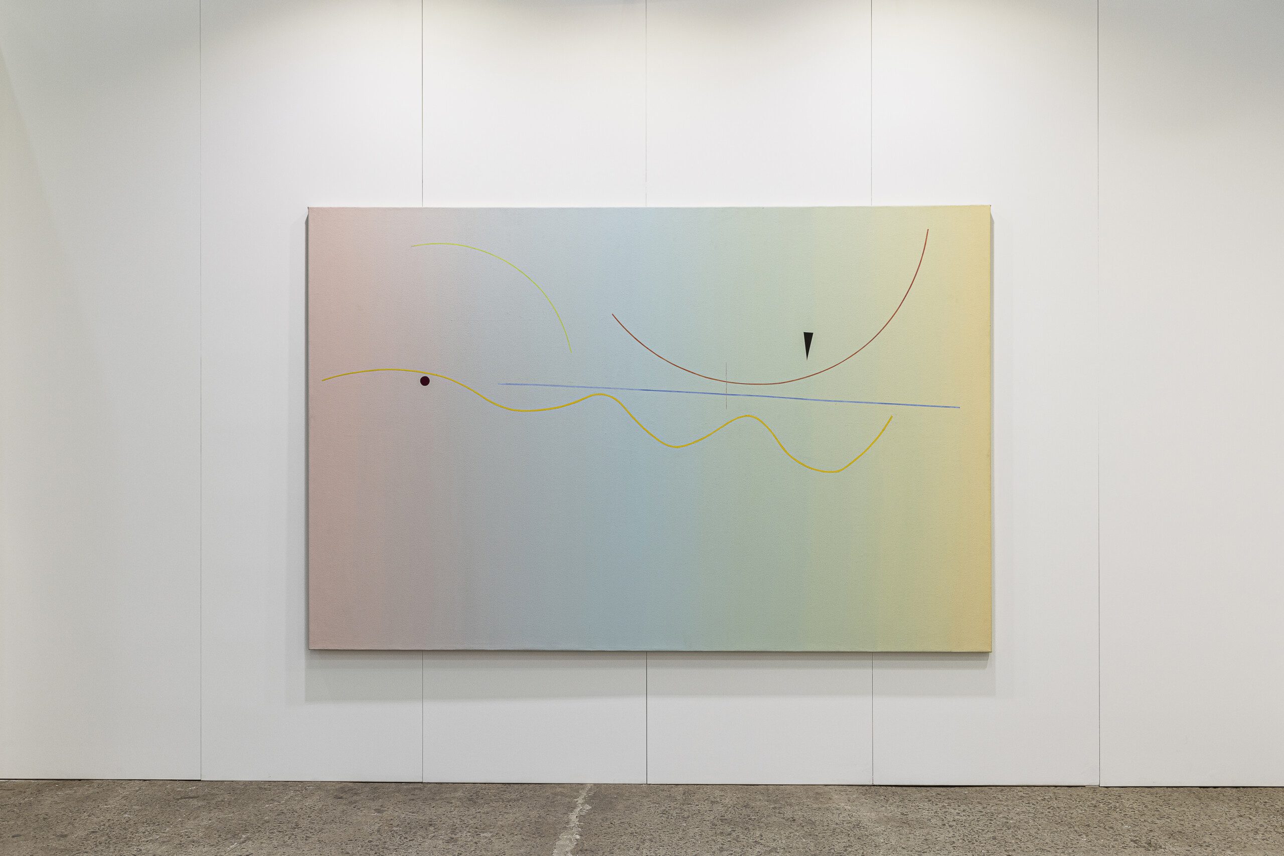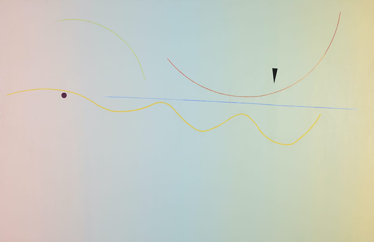 Juxtaposed against these fields of blended colour are delicate arcs, rods, triangles and dots of colour, painted by hand or drawn or collaged onto the canvas in black, acidic greens and vivid primaries. There is a playful, acrobatic sense in the way Cuppaidge conjures these forms with precision and calculated risk. They too evince a sculptural awareness of balance. Their painterly antecedents may lie with Miro but they also respond to the airiness of an Alexander Calder mobile or a Kenneth Snelson tensile construction, hovering and extending in space.