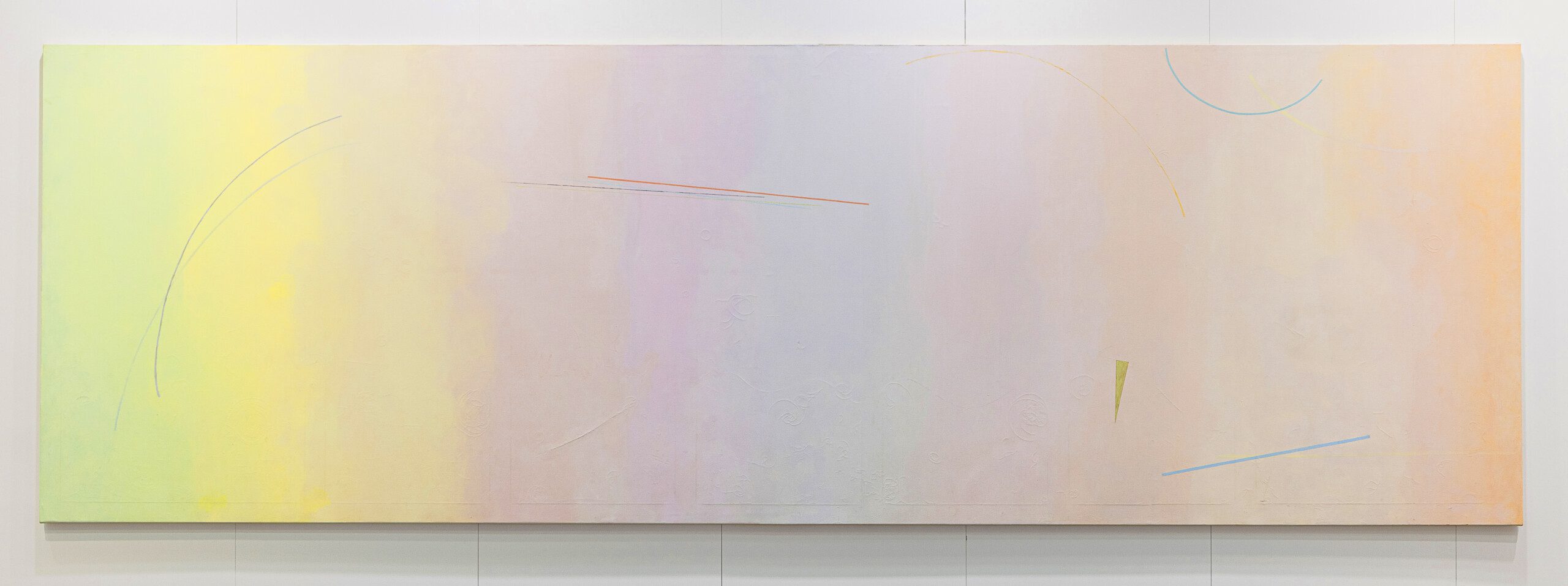 After setting up her live-in studio, Cuppaidge took advantage of the huge expanses of wall space and began work on one of the many paintings she completed there, a six-metre painting called Cytheria, 1977. Her aim was to create a sense of calm to contrast the frenetic pace of New York. The effect she finally achieved was a gentle gradient of almost translucent colour, fading effortlessly from pale yellow to lilac and orange, so softly applied it appears cloud-like.