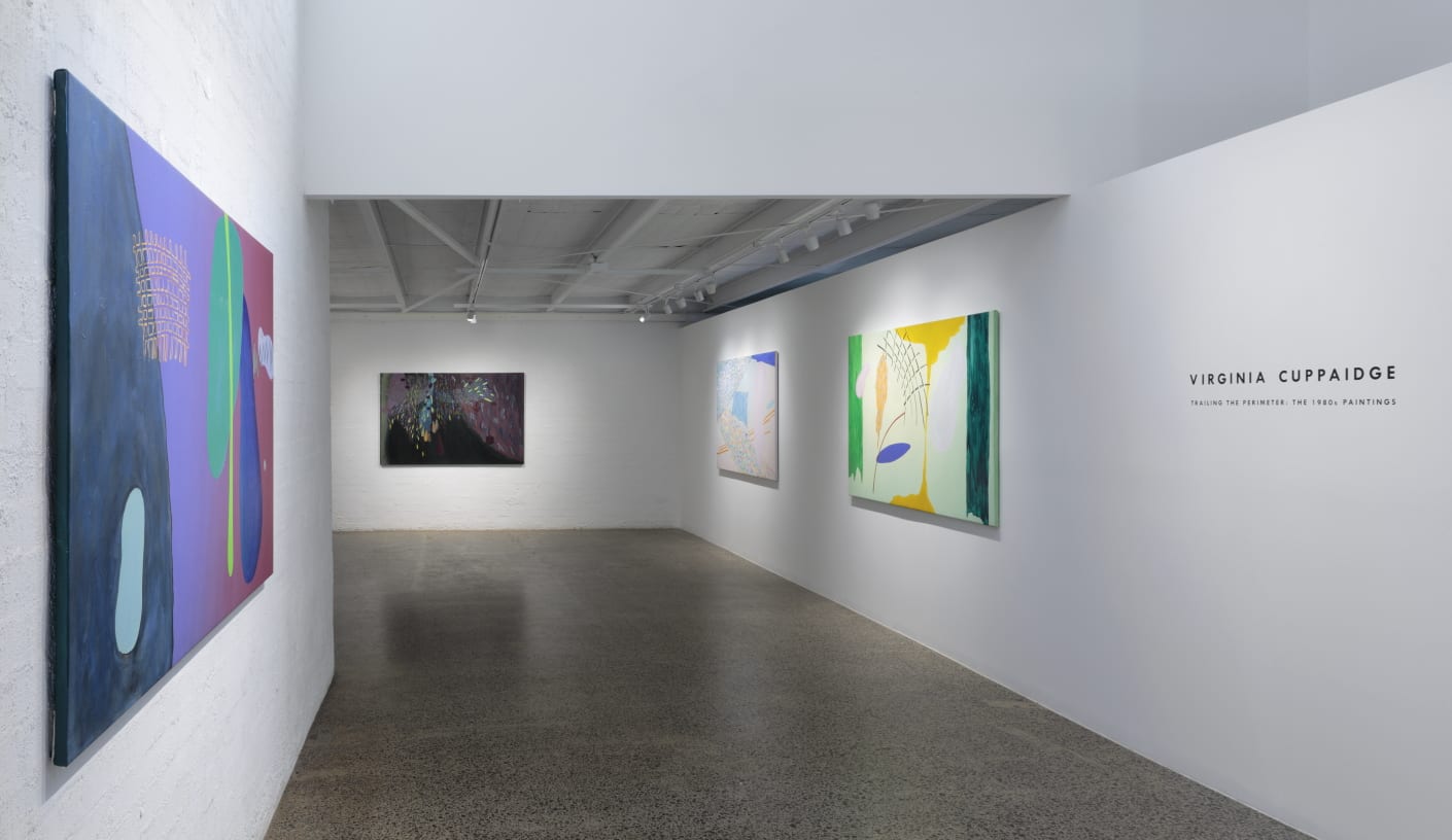 A marked departure can be observed in Virginia’s work of the 1980s – perhaps a response to the vast cultural and political changes afoot in the world at the time. The picture plane begins to loosen up and her lines, shapes and forms now float in space, no longer anchored to the surface. The palette softens, with the occasional lurid break out. Amoeba-like shapes dance across the canvas, or a gentle line arcs and curls through a grainy, sfumato colour field. But always, through her evolution, her constant friends – nature, light and colour remain steadfast. As critic, Corinne Robins observed in her catalogue essay for the artist’s 1986 exhibition at Stephen Rosenberg Gallery in SoHo; ‘The viewer…is convinced that Cuppaidge has caught for us, depicts before our eyes the process, the mid-point between ebb and flow, of organic change’. Life Wave (1986), one of the key works in the exhibition is a great summation of this new sensibility emerging in her work of this decade. Soul Search (1984) reflects Virginia’s seeking of new ways of looking and being. But, if ever there was a work to place in one’s SoHo loft beside the perfect Ettore Sottsass Carlton bookcase (1981), it would be Vrinda (1982). Thus, there is an inevitable nostalgia to the works in Trailing the Perimeter. For this curator, who is trying to be detached and reasoned, I give in and allow myself to be swept back by the power of the work to my formative taffeta-clad hey days of the 1980s when the world turned decidedly post-modern.