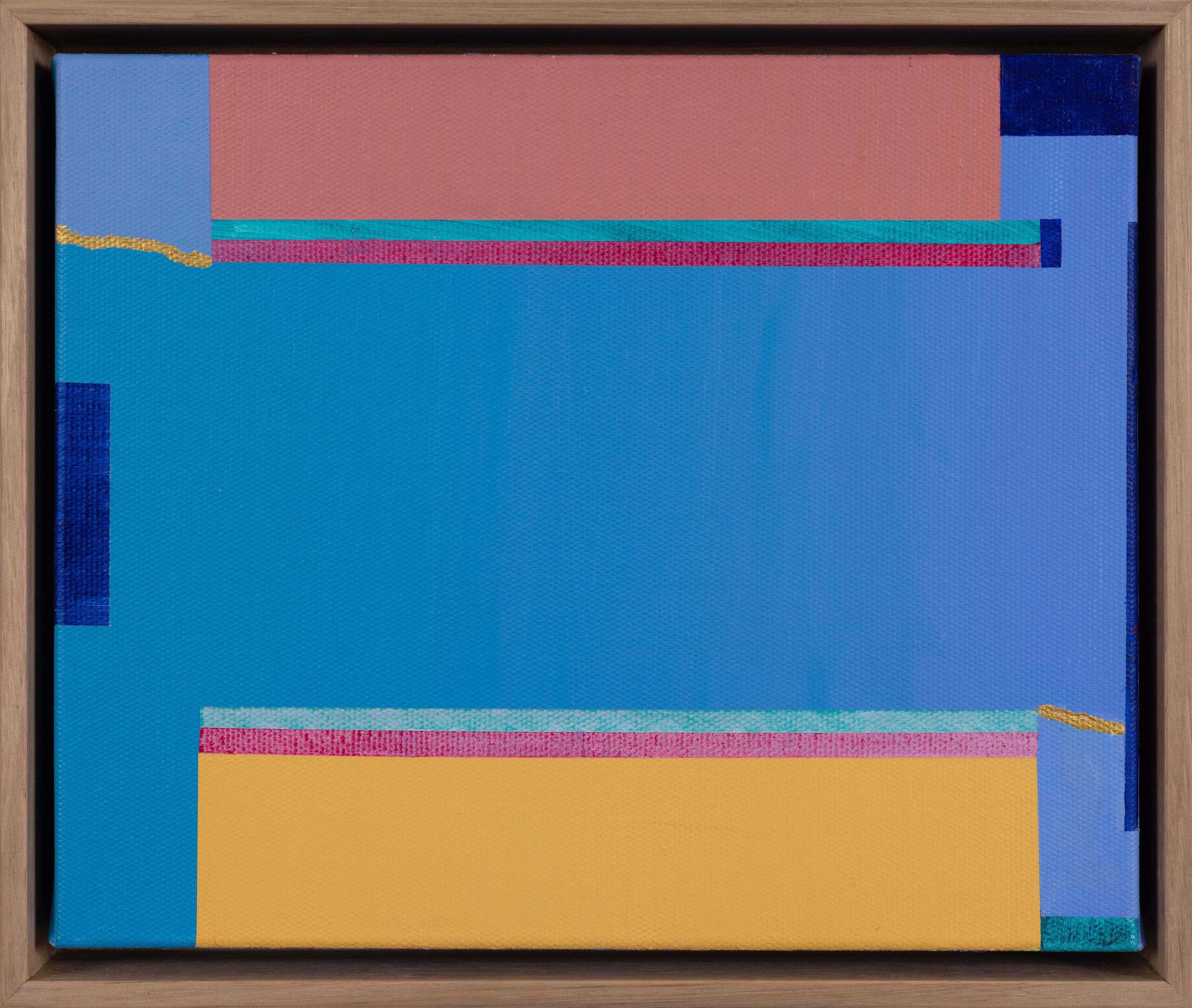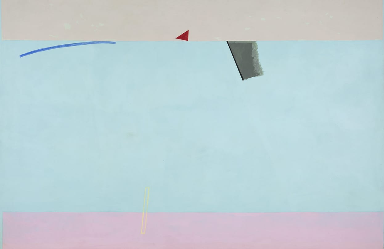 The earliest work in the exhibition, Sapphire, 1977, represents a transition from Cuppaidge’s first series painted in New York: the Geometrics. Begun in 1970, and inspired initially by Manhattan’s ‘looming skyscrapers on the dark avenues’, the Geometrics are large horizontal abstract compositions framed along the top and bottom with two rectangles of contrasting or unexpected colours (turquoise and yellow, maroon and blue, or – in the case of Sapphire – pale salmon and candy pink).[1] The rectangles are tautly separated by an in-between zone, often loosely brushed in, akin to a breath or to the air between two hands held one above the other without touching.[2] Both the large slabs of colour and the careful attention to painterly process reflect the sort of work Cuppaidge responded to at the time: Brice Marden’s minimalist canvases, Mark Rothko’s soft-edged forms and Hans Hofmann’s rigorously structured blocks of intense colour.