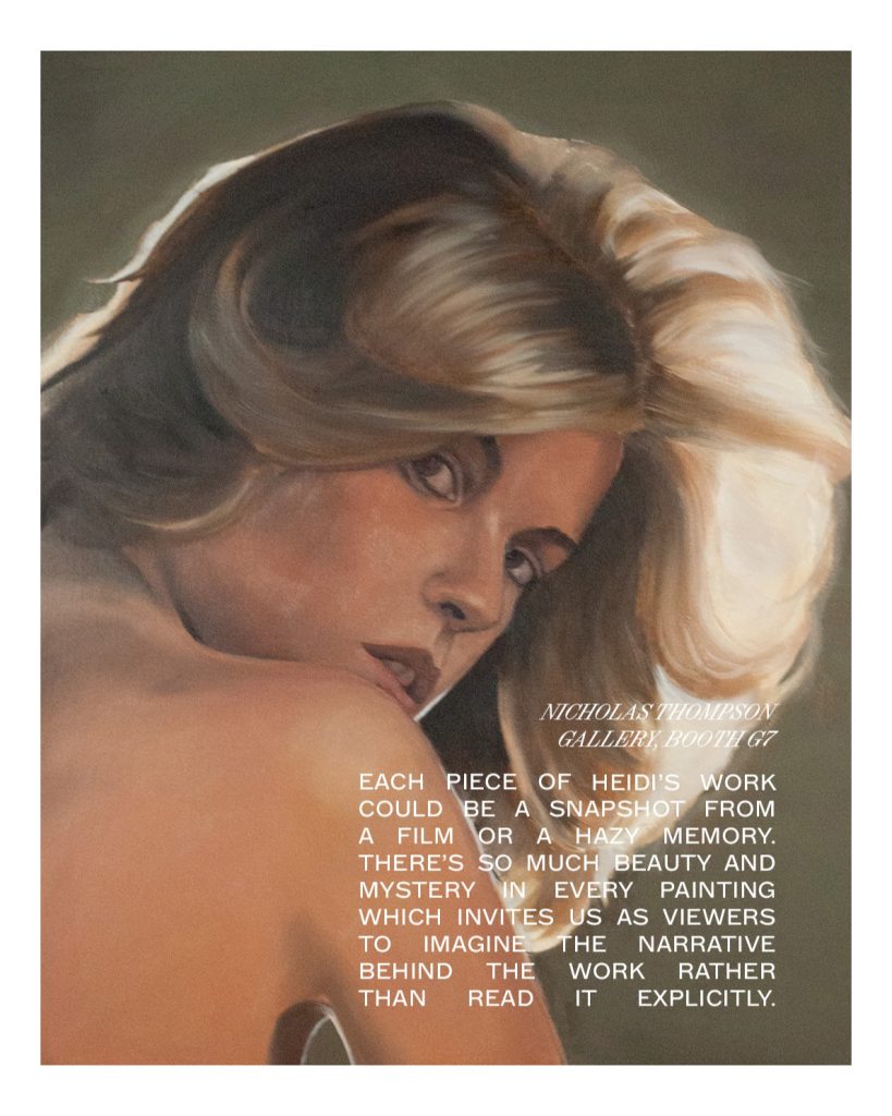 “Each piece of Heidi’s work could be a snapshot from a film or a hazy memory. There’s so much beauty and mystery in every painting which invites us as viewers to imagine the narrative behind the work rather than read it explicitly.” Rebecca Harding