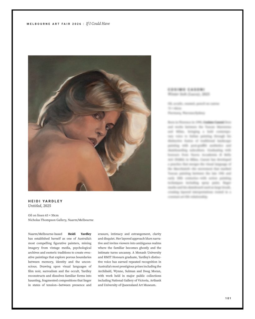 Heidi Yardley in current issue 115 of Art Collector – Melbourne Art Fair special edition ‘If I could have’ ‘Naarm/Melbourne-based Heidi Yardley has established herself as one of Australia’s most compelling figurative painters, mining imagery from vintage media, psychological archives and esoteric traditions to create evocative paintings that explore porous boundaries between memory, identity and…