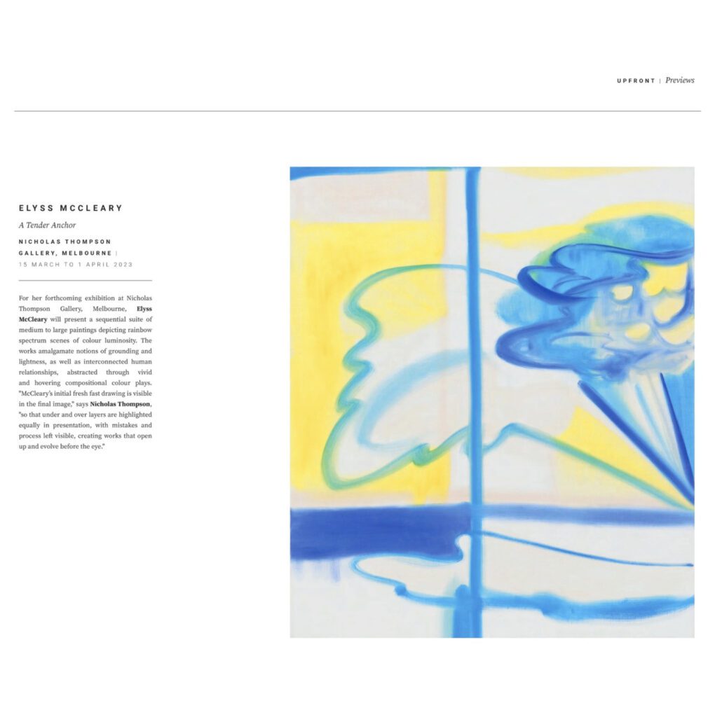 For her forthcoming exhibition at Nicholas Thompson Gallery, Elyss McCleary will present a sequential suite of medium to large paintings depicting rainbow spectrum scenes of colour luminosity. The works amalgamate notions of grounding and lightness, as well as interconnected human relationships, abstracted through vivid and hovering compositional colour plays. “McCleary’s initial fresh fast drawing is…