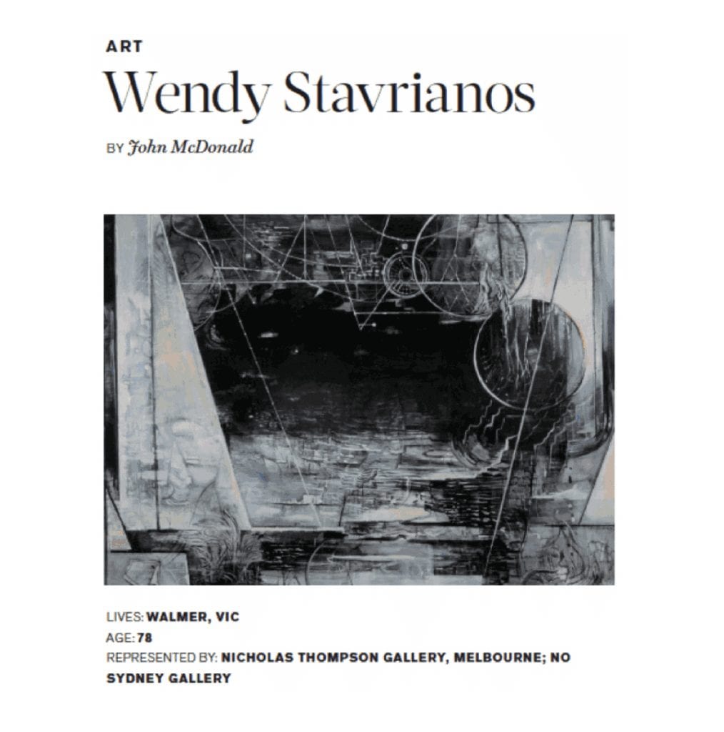 Art: Wendy Stavrianos By John McDonald September 20, 2019 — 11.44pm Wendy Stavrianos. Lives: Walmer, VIC. Age: 78. Represented by: Nicholas Thompson Gallery, Melbourne; no Sydney gallery Her thing. Expressive, semi-abstract landscapes of the imagination. Our take. Wendy Stavrianos’s new works explore that borderline between the studio and the external world, between observation and memory, landscape and invention. It’s been…