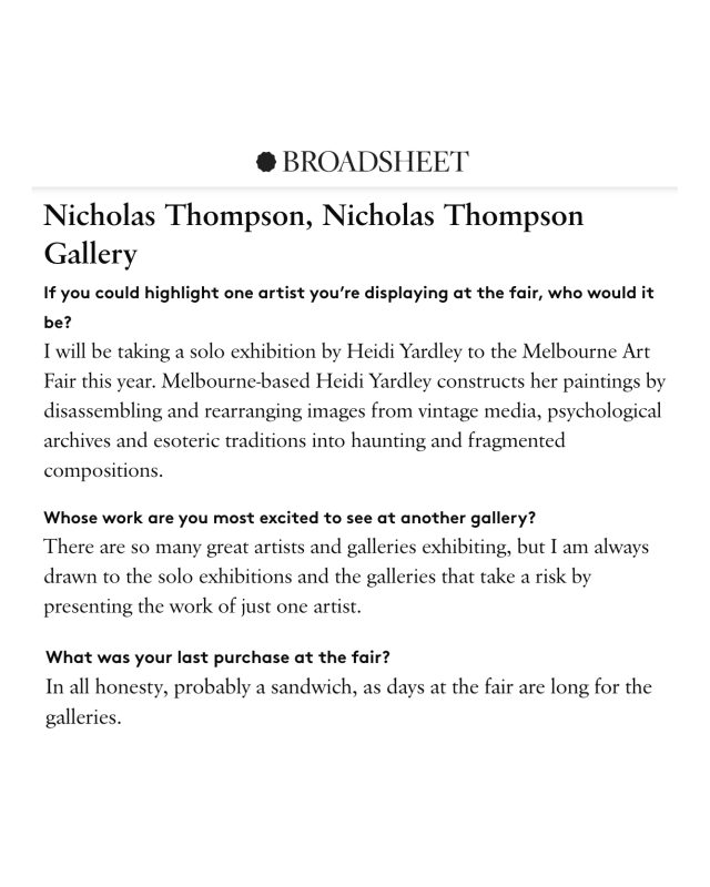 Heidi Yardley in current issue 115 of Art Collector – Melbourne Art Fair special edition ‘If I could have’ ‘Naarm/Melbourne-based Heidi Yardley has established herself as one of Australia’s most compelling figurative painters, mining imagery from vintage media, psychological archives and esoteric traditions to create evocative paintings that explore porous boundaries between memory, identity and the unconscious. Drawing upon visual languages of film noir, surrealism and the occult, Yardley reconstructs and dissolves familiar forms into haunting, fragmented compositions that linger in states of tension-between presence and erasure, intimacy and estrangement, clarity and disquiet. Her layered approach blurs narrative and invites…